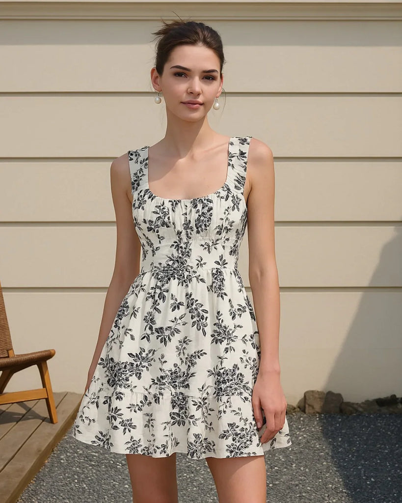 The Sweetheart Neckline Floral Knotted Mini Dress In Black Print brings soft cottage-core vibes in a super wearable shape. It features a ruched bust, wide straps, and a knotted front that gives it charm without trying too hard. The black floral print on ivory keeps it classic and easy to style.