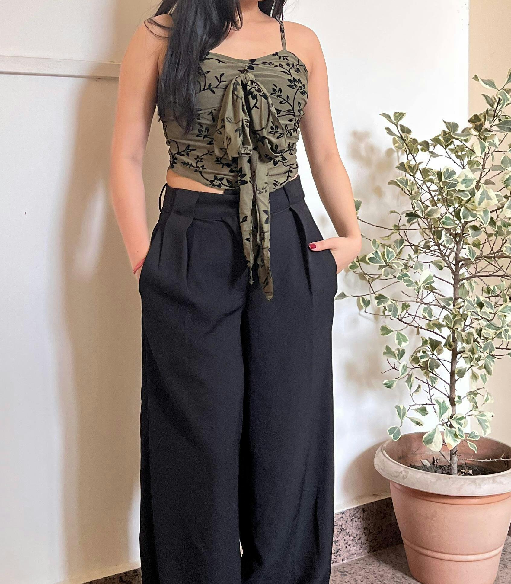 Introducing our Mesh V-neck Floral Lettuce Trim Knotted Crop Cami Top. This crop cami top is your soft statement piece for dreamy fits. Designed with a sheer mesh overlay, velvet floral detailing, and a front tie knot, it brings all the vintage energy with a modern twist. The lettuce trim hem adds a delicate finish, while the angled cut flatters your waistline.