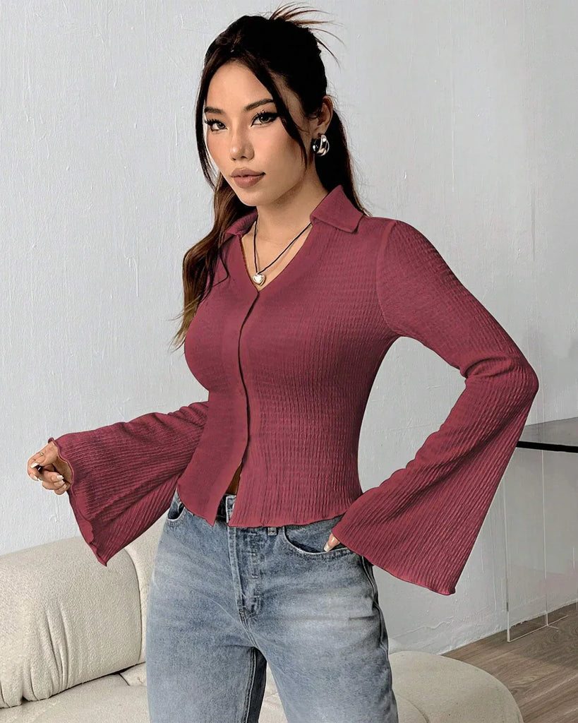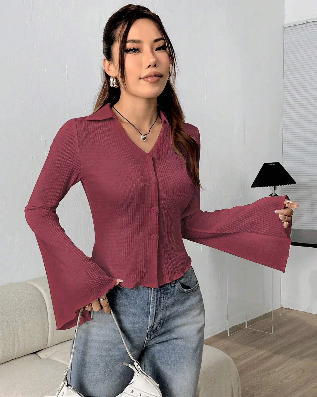 Add a touch of drama to your everyday fits with this fitted knit design that stands out among bell sleeve tops. Featuring a classic button-down front, slim fit, and flared sleeves, it’s the perfect mix of polished and trendy. The deep maroon color makes this one of those versatile bell sleeve tops that easily shifts from casual plans to evening outings.