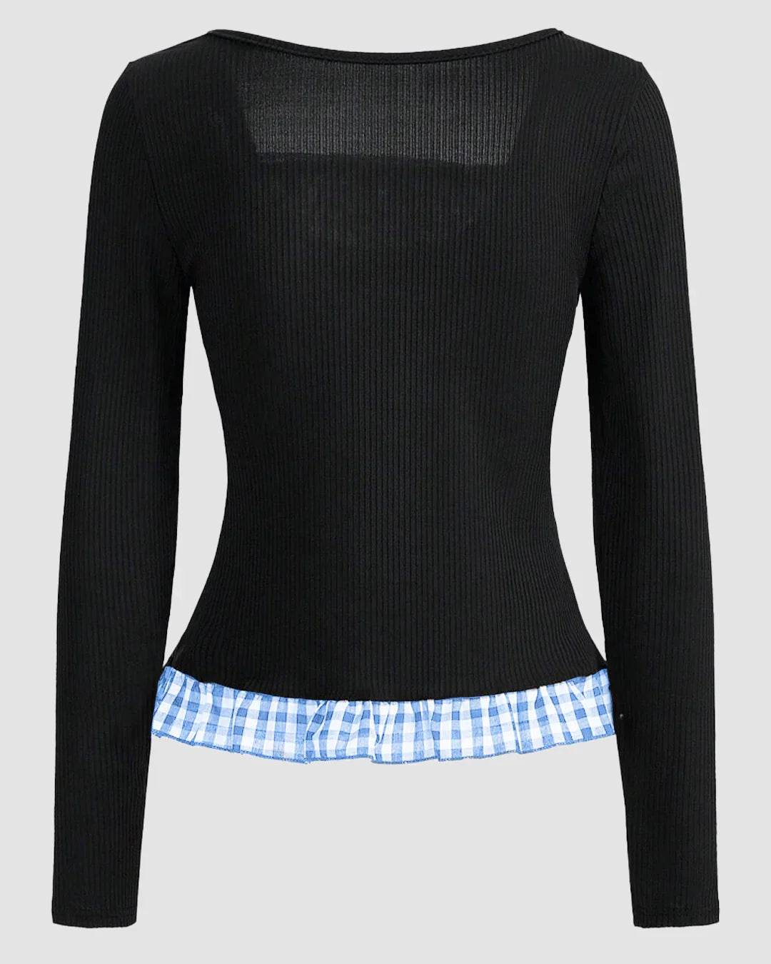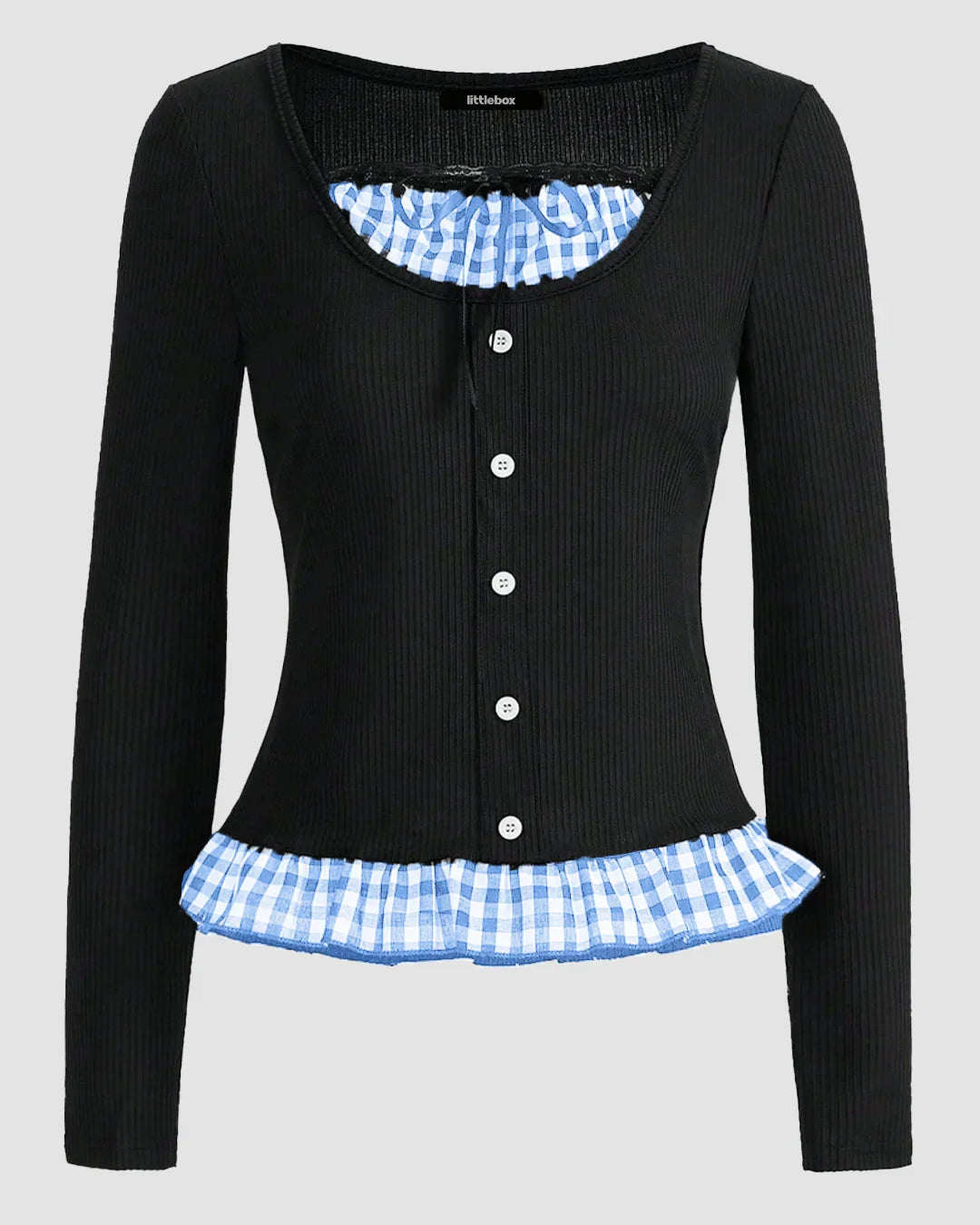 "This round neck full sleeve top gives a flirty twist to everyday style. The fitted ribbed texture and front button-down detail make it effortlessly chic, while the gingham trim and ribbon tie add a playful edge. Designed in classic black, this round neck full sleeve top blends soft femininity with a hint of retro charm. Made with a polyester-spandex mix, it’s lightweight, stretchy, and moves with you comfortably through the day.