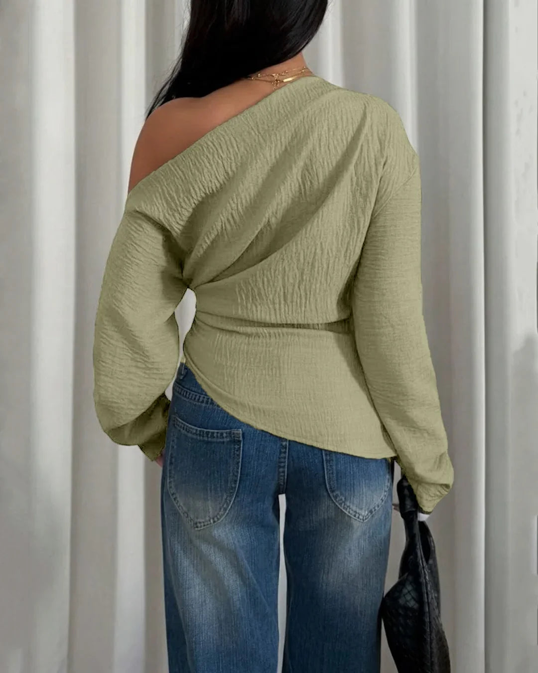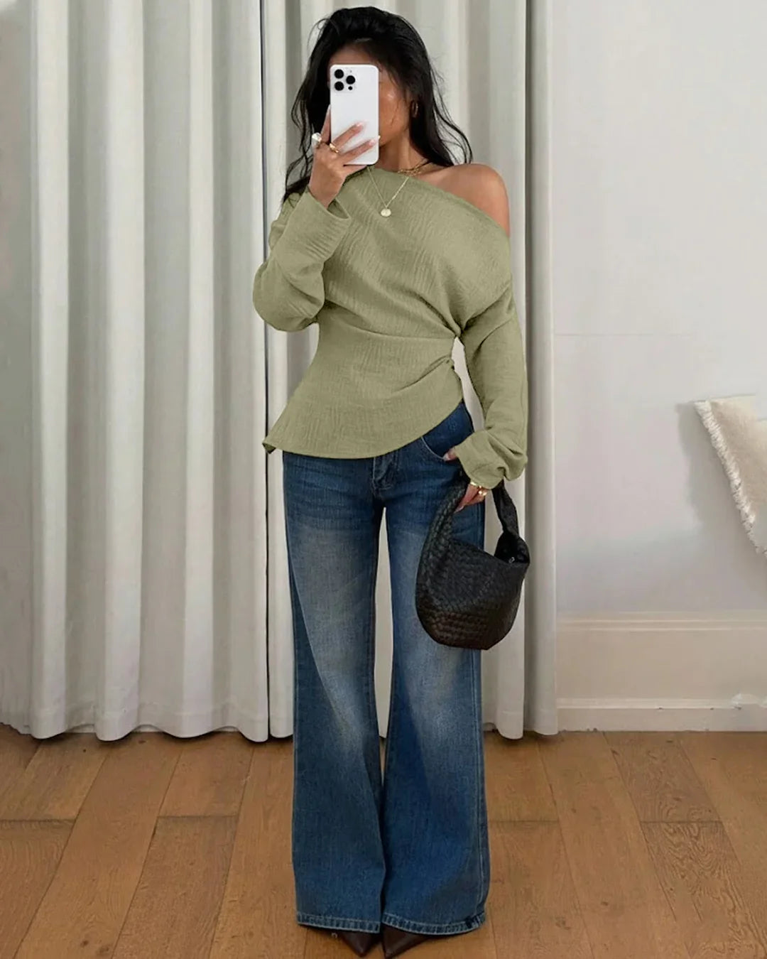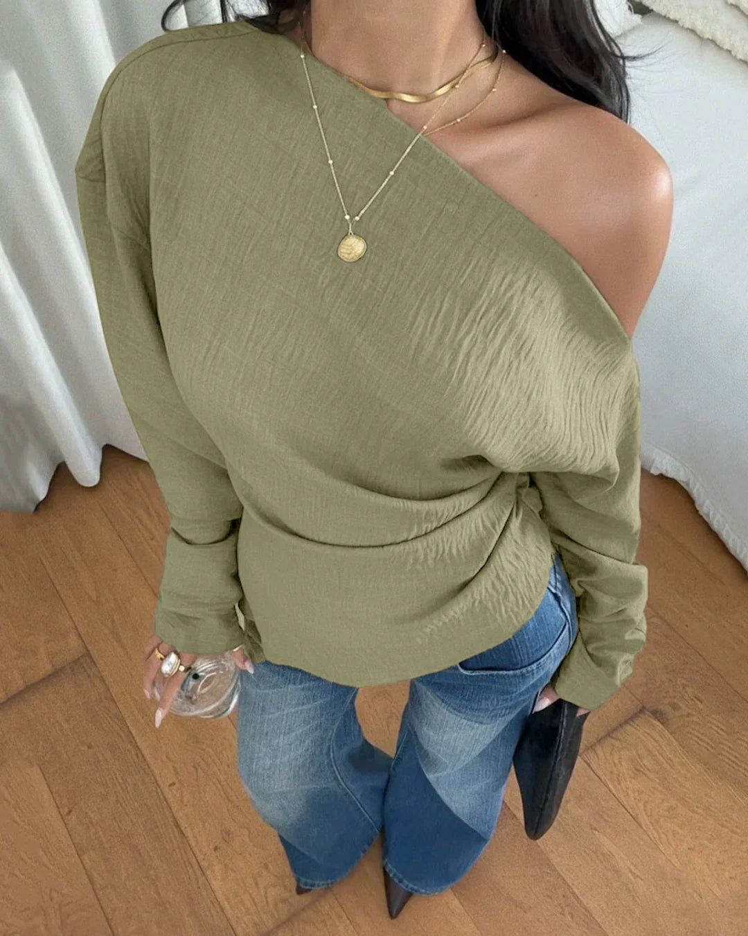 Off-Shoulder Solid Color Asymmetrical Neck Top in Herbal