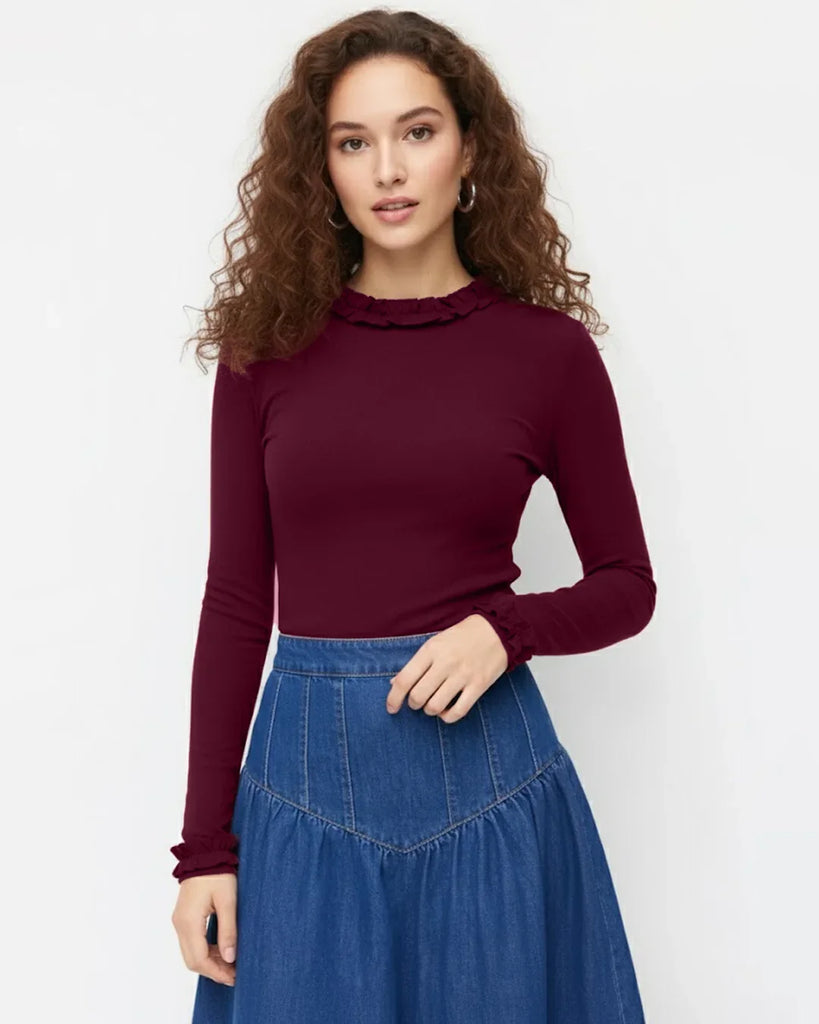 This ruffle trim top in burgundy adds a touch of elegance to your everyday fits. Designed with a soft round neckline and delicate ruffle detailing along the collar and cuffs, it gives a subtle vintage charm while staying effortlessly wearable. The long sleeves balance the fitted silhouette, making it perfect for layering under blazers or pairing with skirts for a chic, polished vibe. Crafted entirely from polyester, this ruffle trim top in burgundy feels lightweight, smooth, and comfortable for all-day wear.