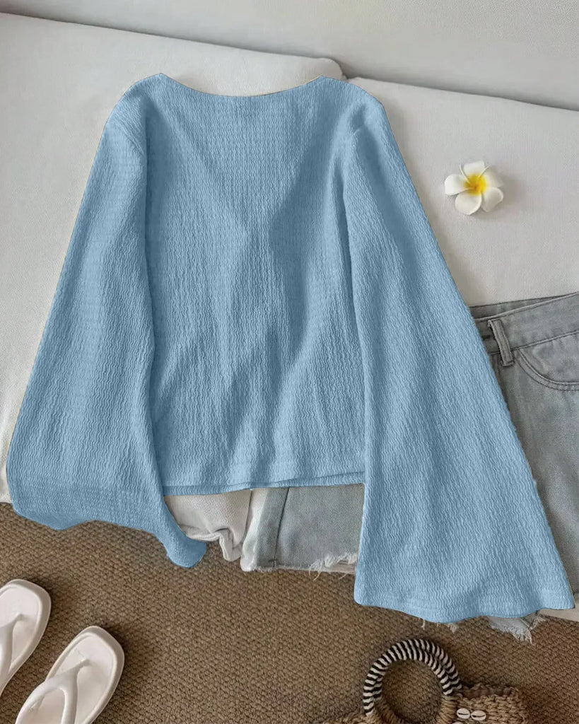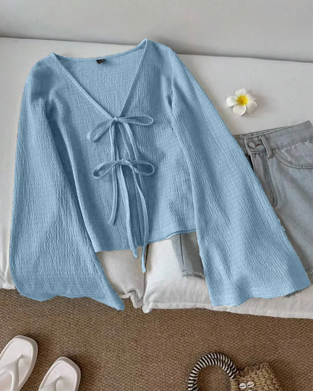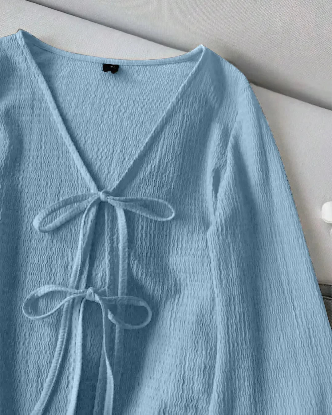 Sky Blue Tie Front Full Sleeve Flared Hem Top