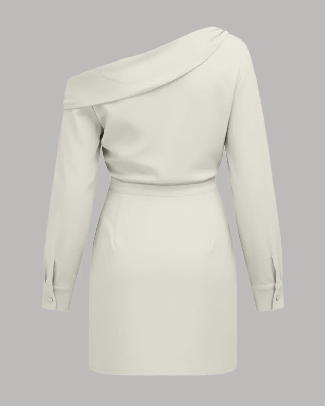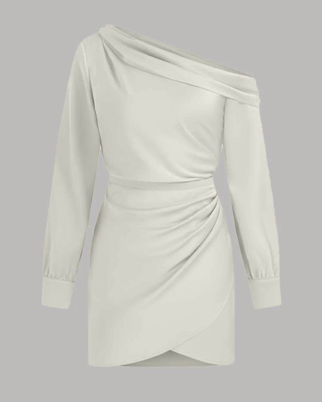 Asymmetrical Neck Pleated Wrap Mini Dress in Off White