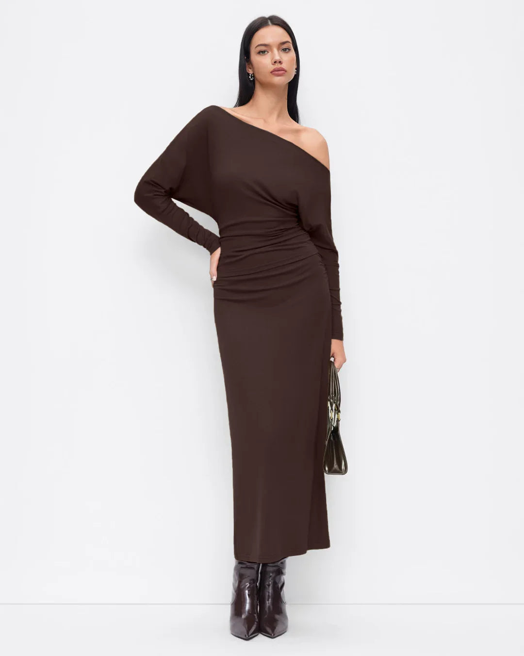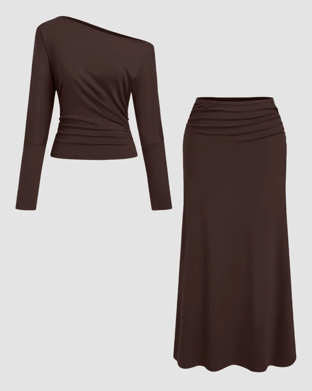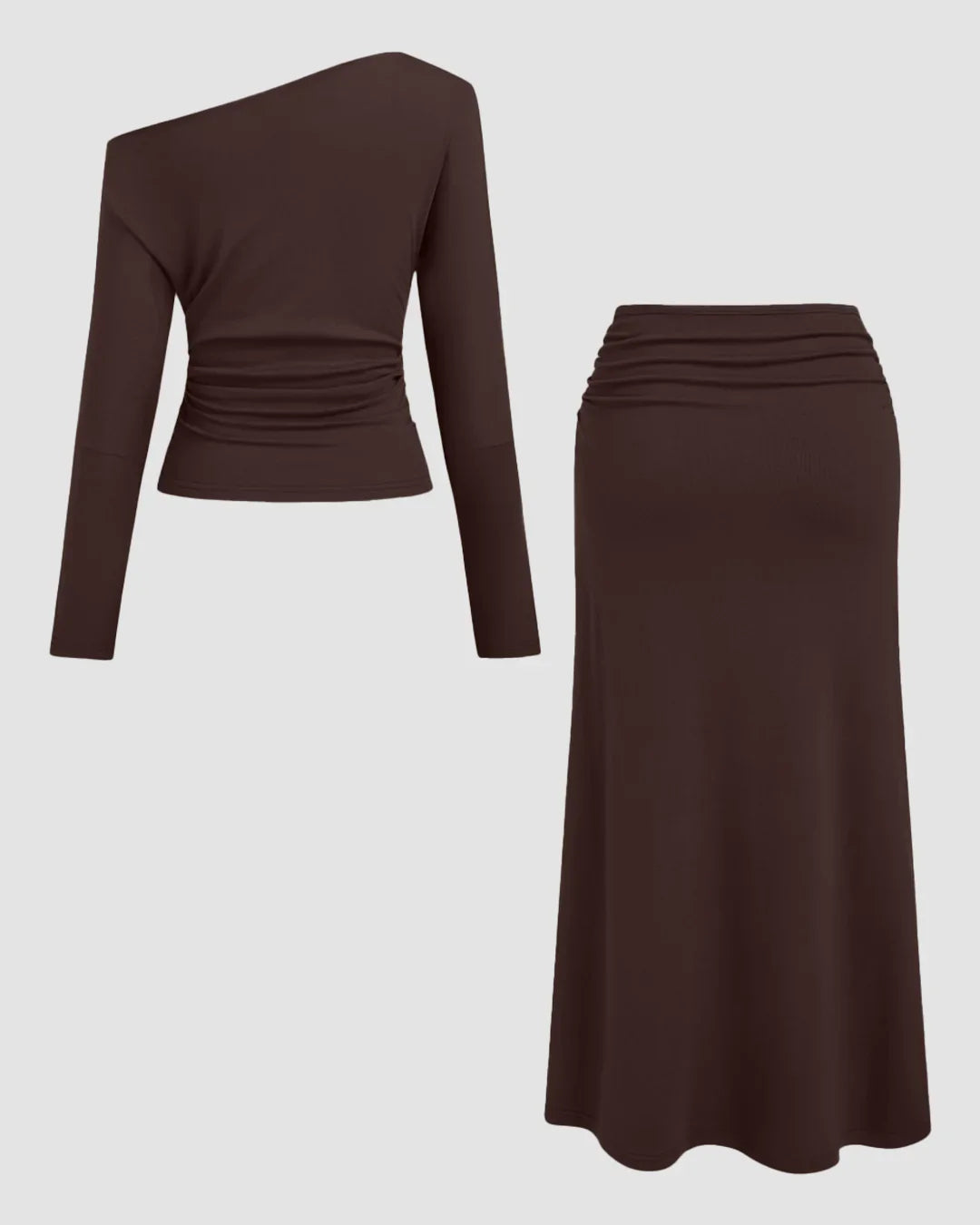 Asymmetrical Neck Ruched Top & Mid Rise Maxi Skirt Set in Chocolate Fondae