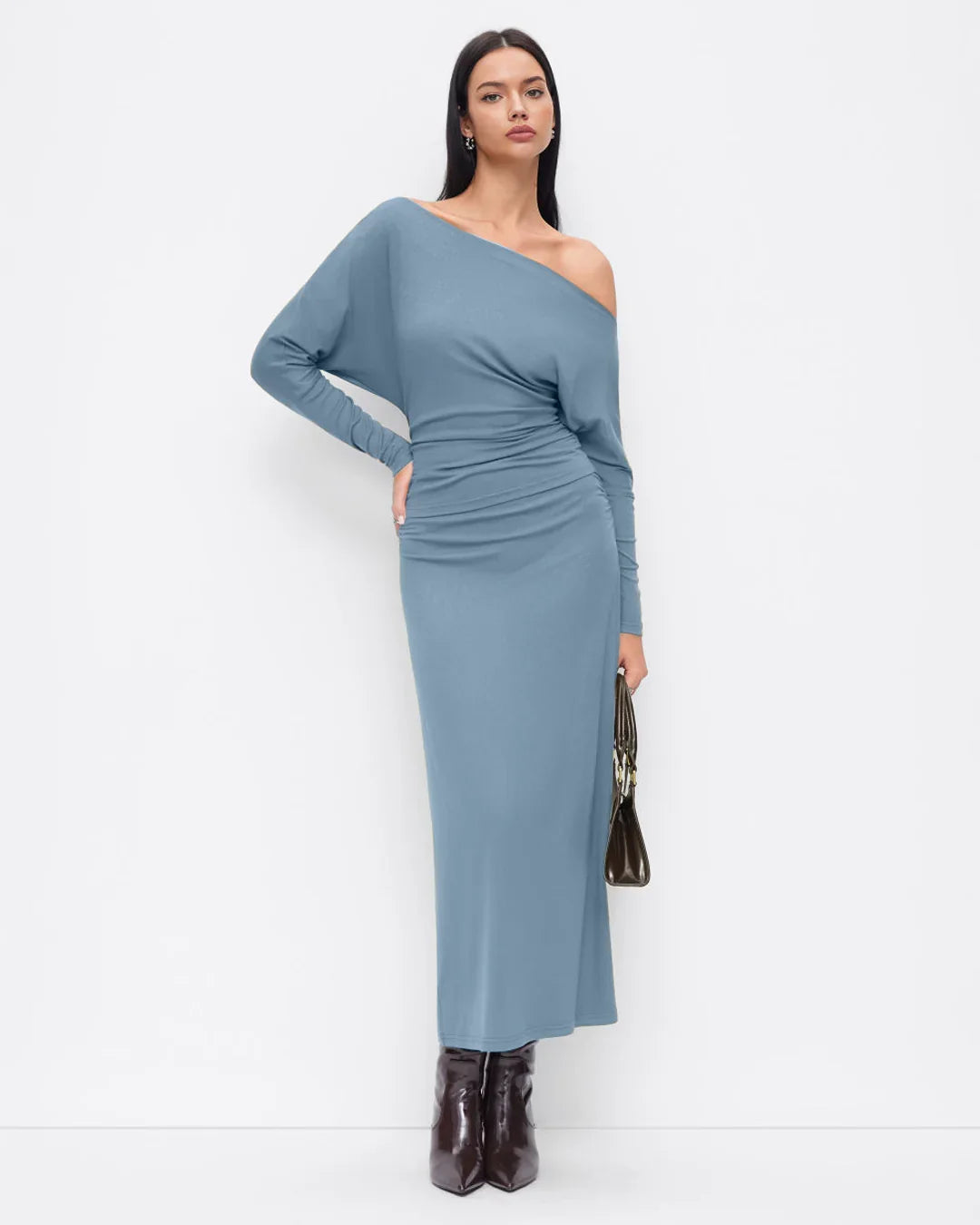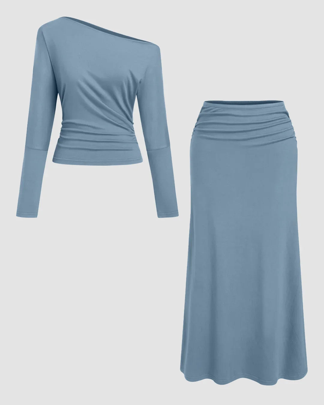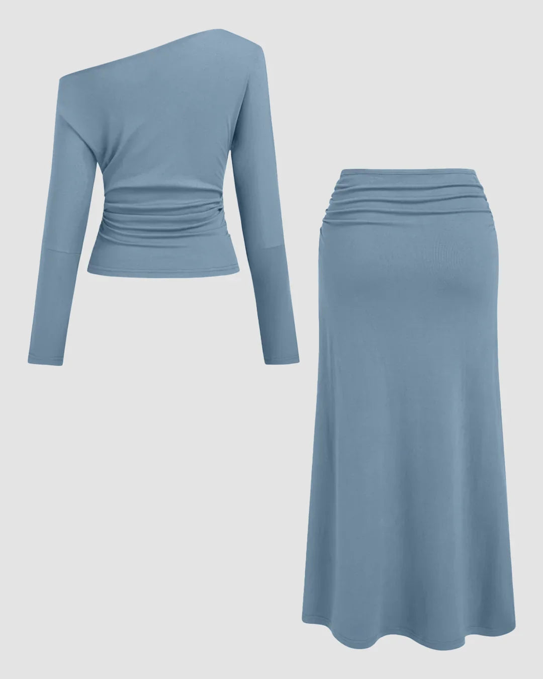Asymmetrical Neck Ruched Top & Mid Rise Maxi Skirt Set in Dusty Blue