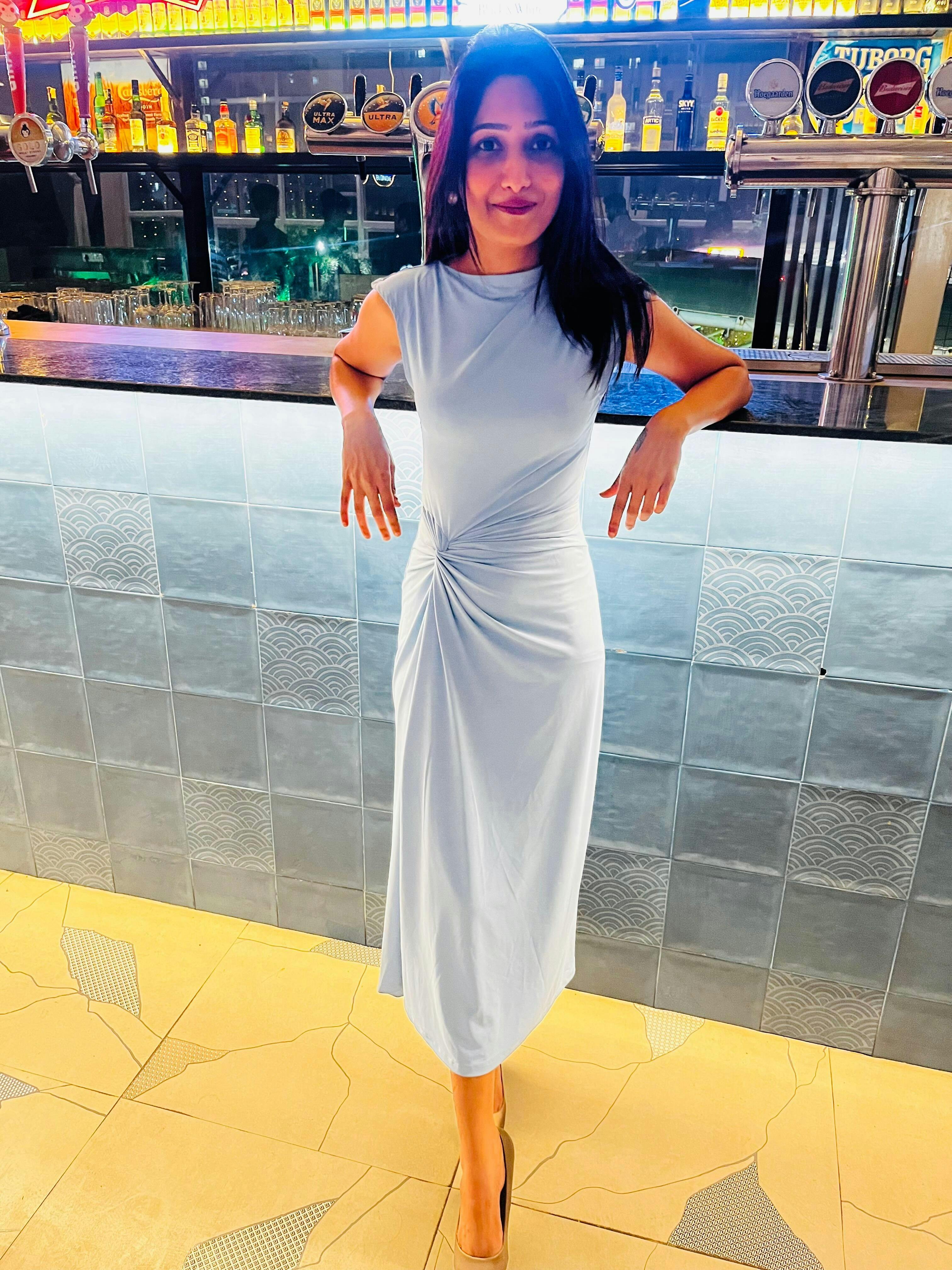 - A versatile blue maxi dress that transitions from day events to evening parties
