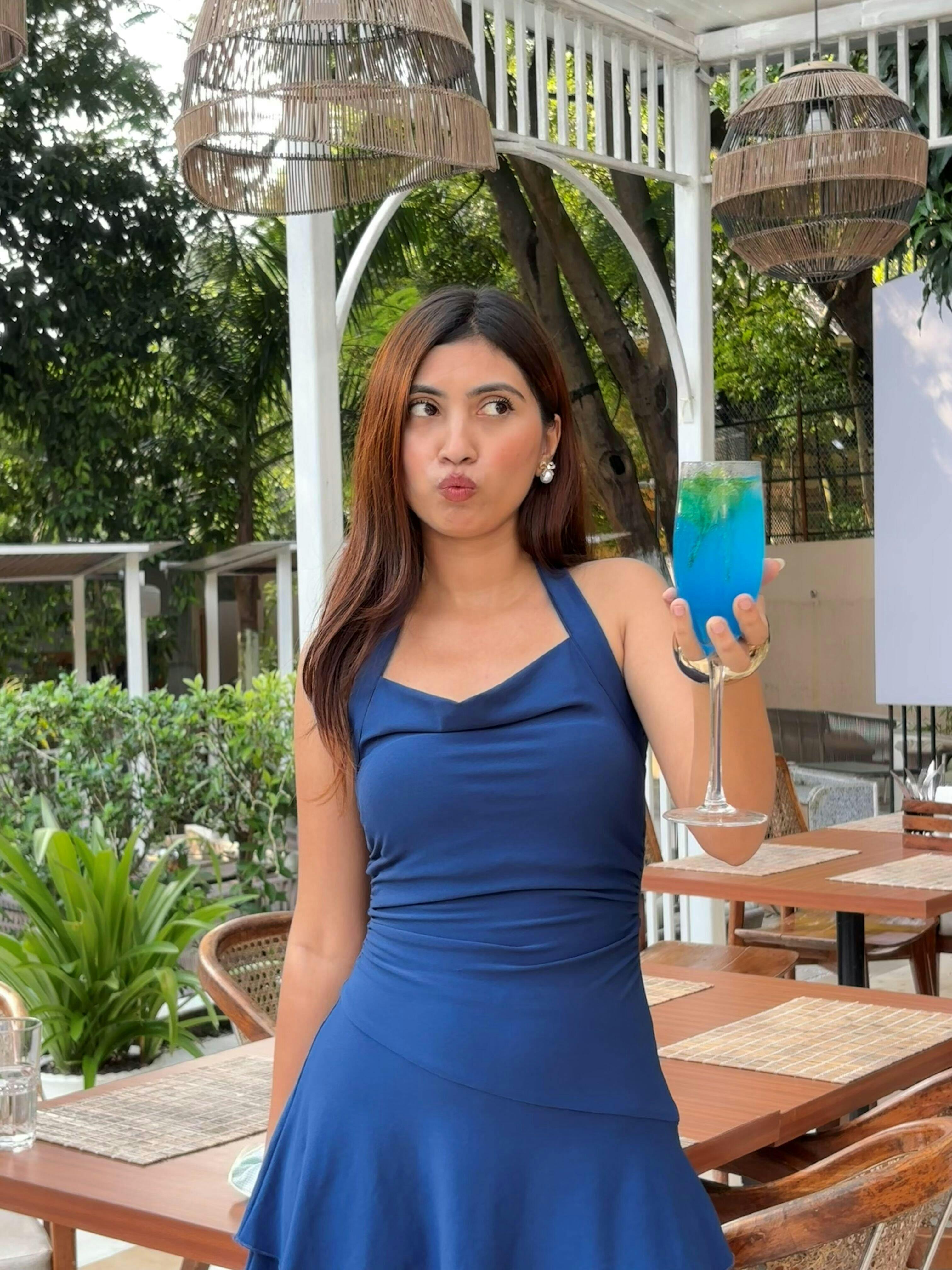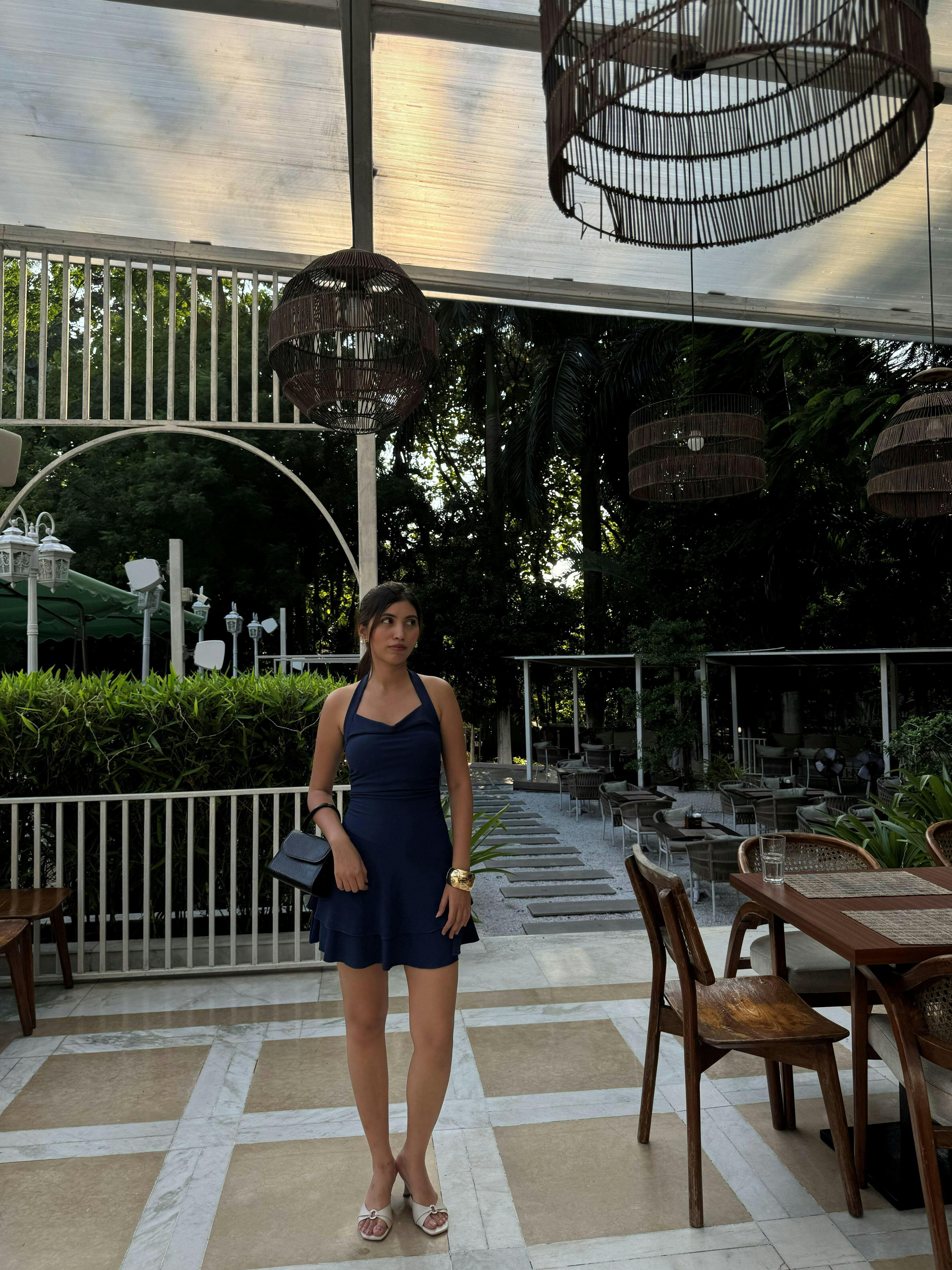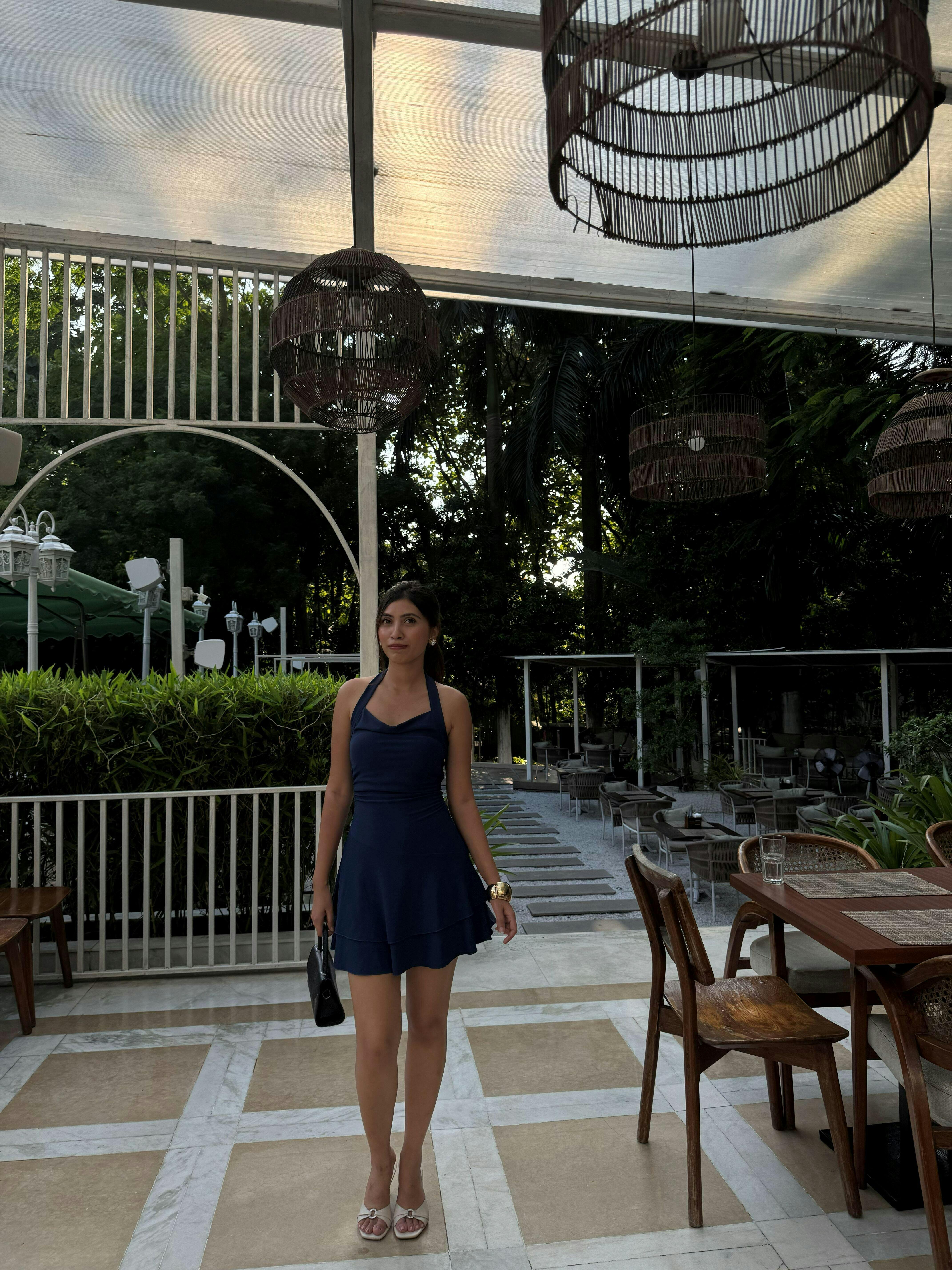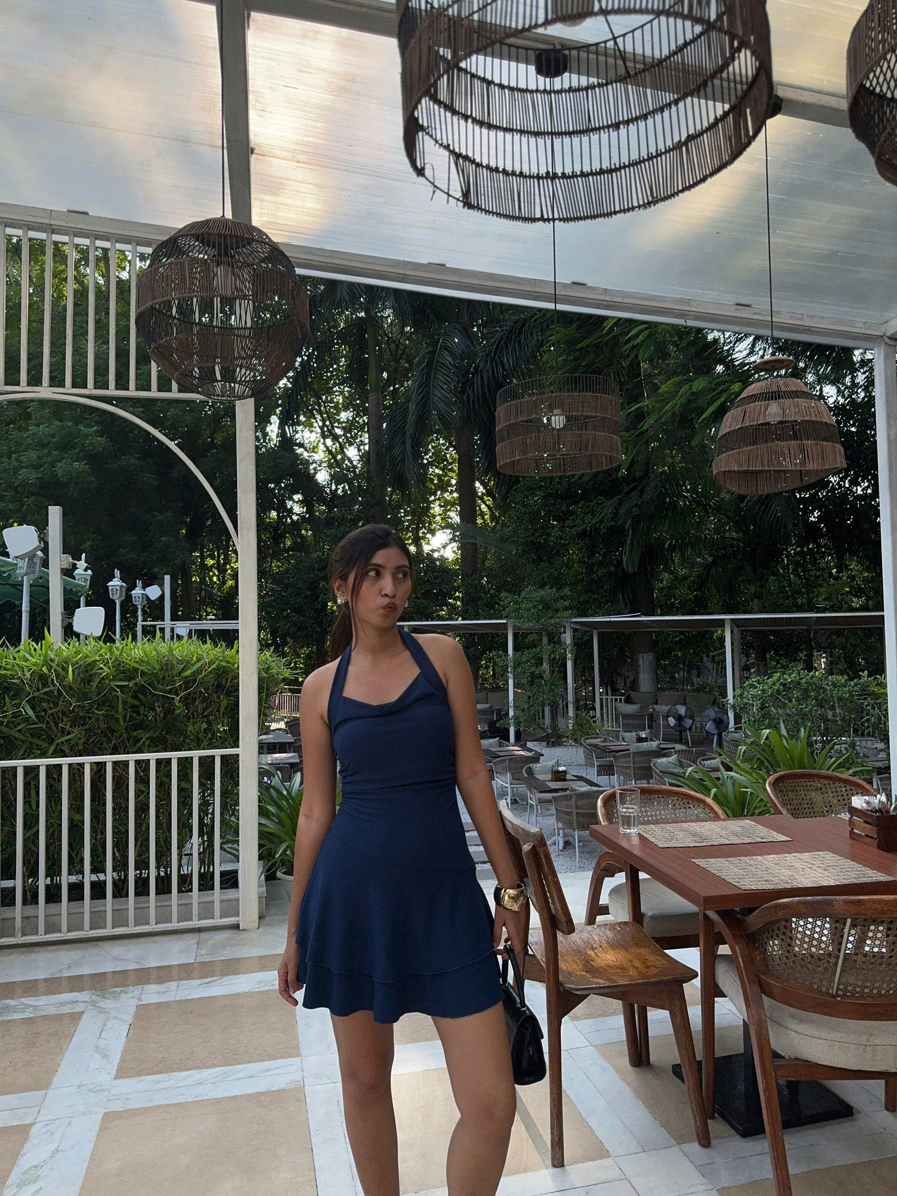 Fun, flirty, and ultra flattering, this navy halter neck skater dress is made to move with you. The ruched waist detail defines your shape, while the double-layered flared hem adds bounce and flow with every step. The halter neckline gives it a polished yet playful vibe.