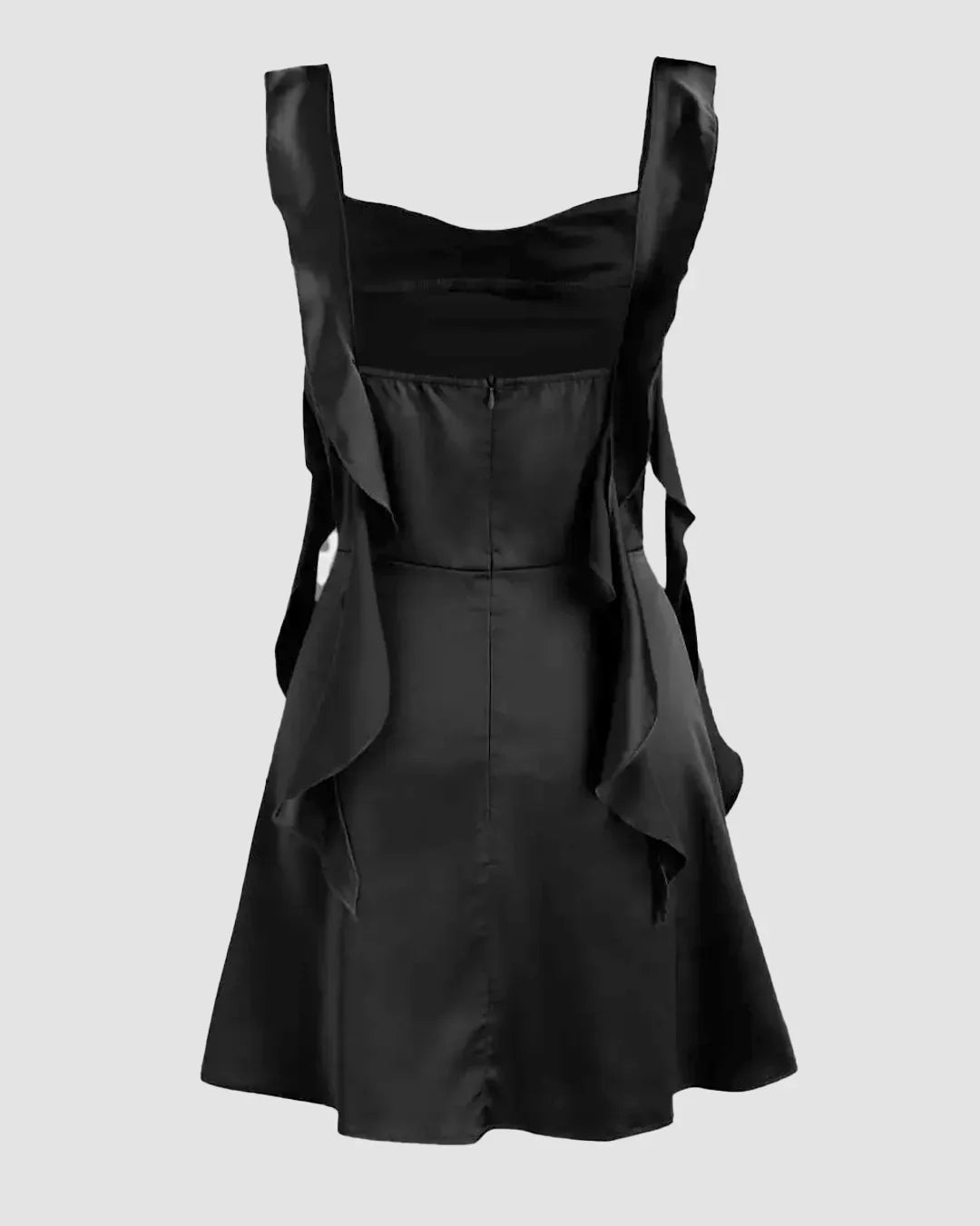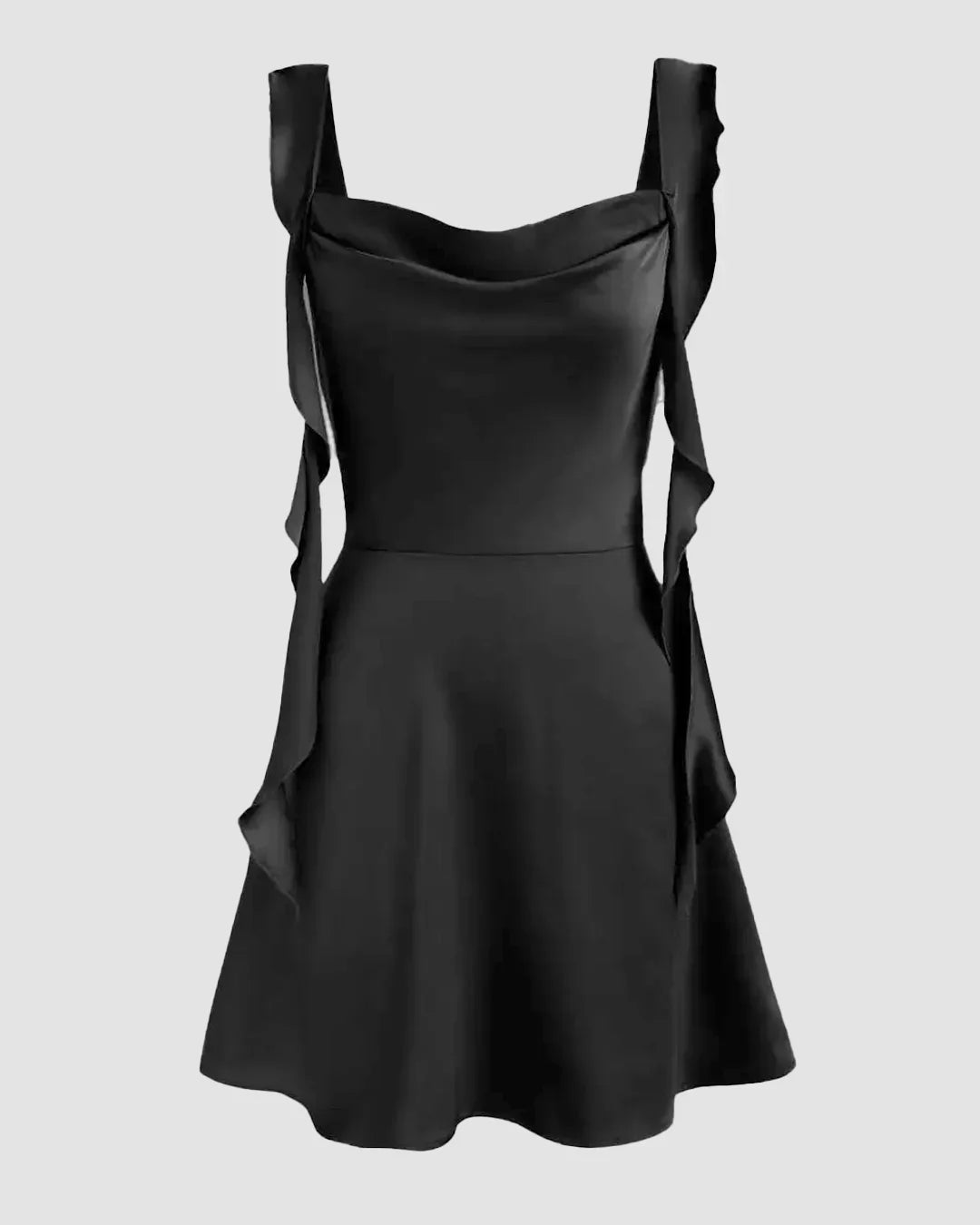 Satin Ruched Ruffle Hem Mini Dress in Black comes with a smooth satin shine and a soft draped neckline that gives a dressed-up look. The side ruffle detail adds gentle movement, and the fitted waist keeps the shape clean and flattering. This Mini Dress in Black is light, sleek and perfect for going-out plans.