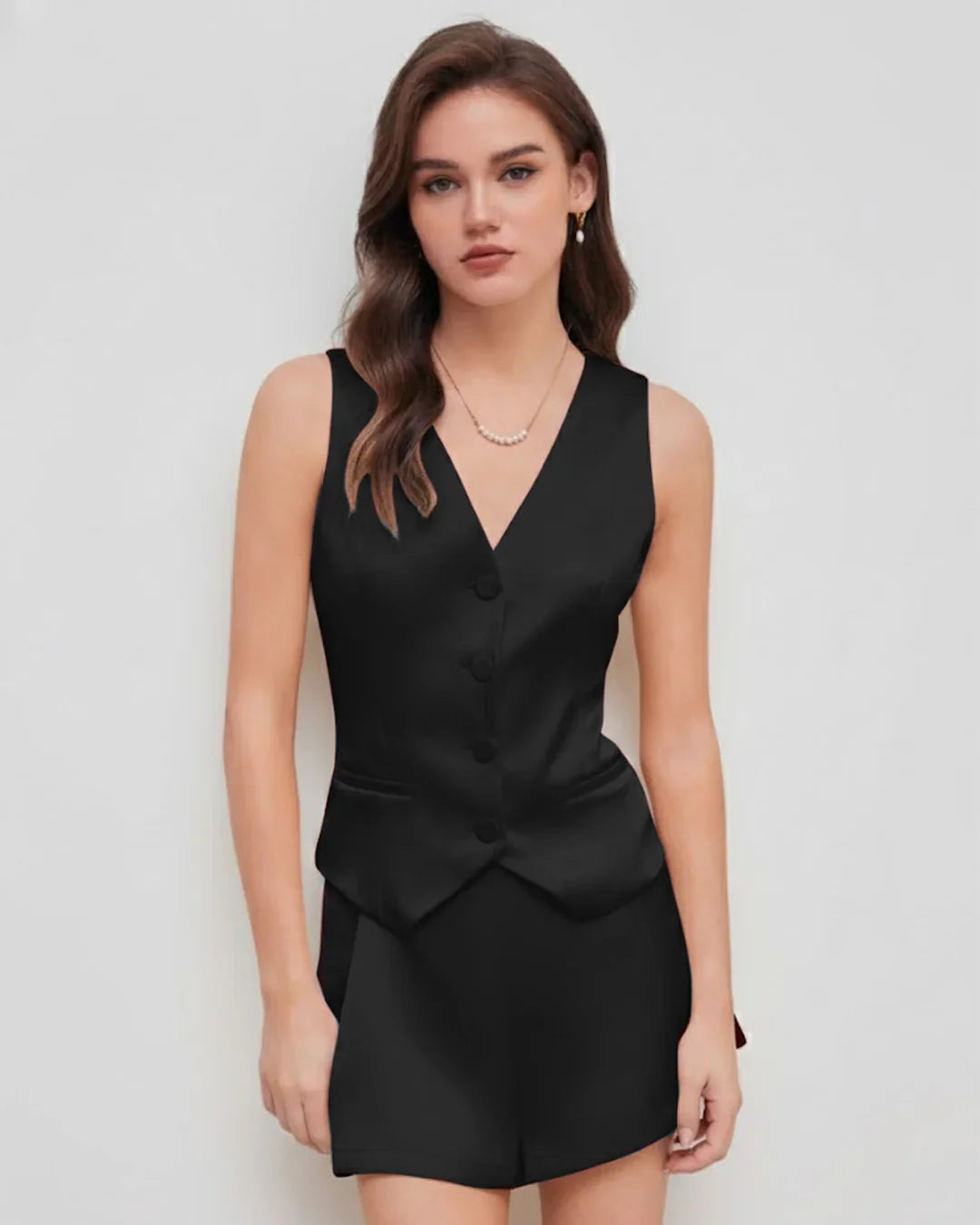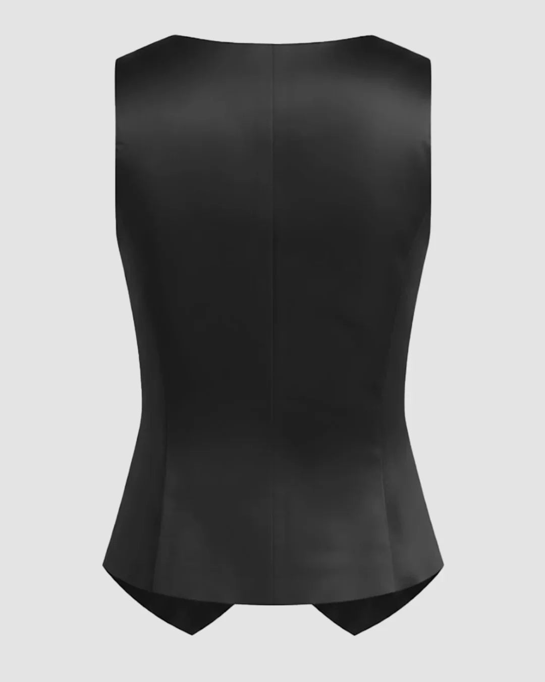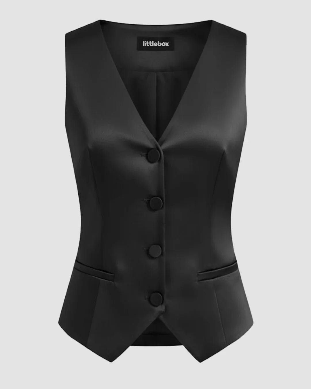 Satin V-neck Solid Button Vest in Black brings a clean, polished vibe with its sleek finish and sharp cut. The fitted shape gives it a structured feel, while the smooth satin texture adds a soft sheen that elevates even the simplest outfit. The V-neckline keeps it classic, and the button detailing creates a neat, tailored look that sits well on the body. This V-neck Vest in Black blends a luxe feel with easy styling, making it a go-to for dressy or smart-casual fits.