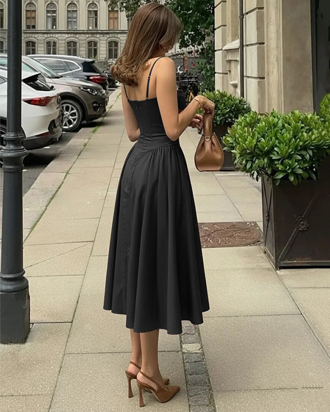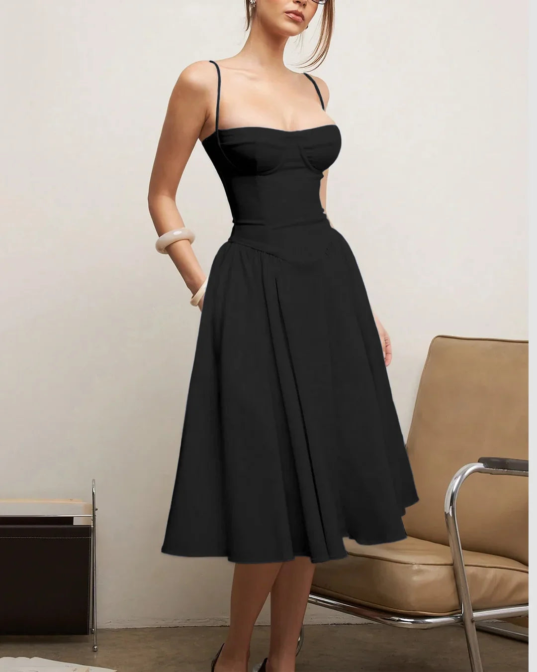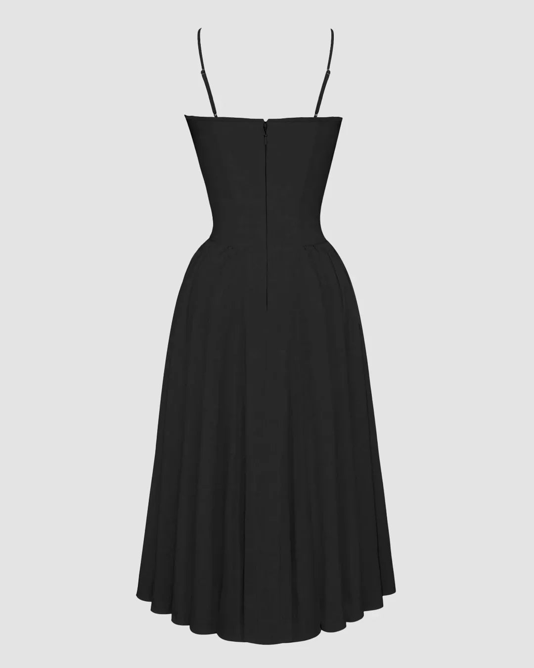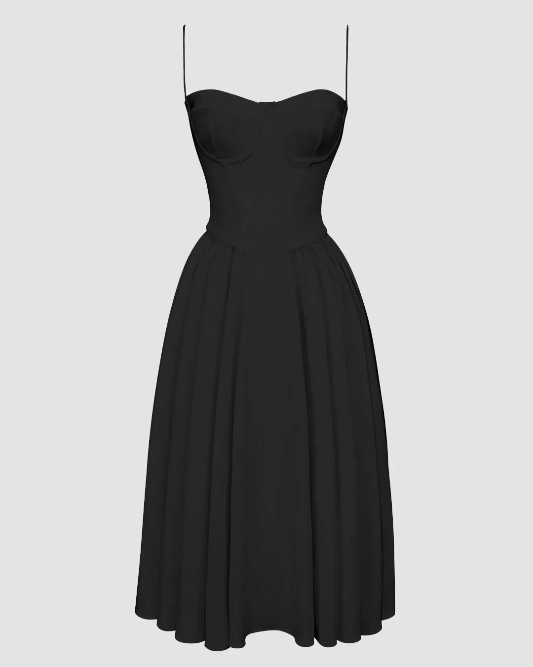 This Corset Midi Dress in Black brings a refined, structured look with its fitted corset-style top and soft flowing midi dress. The spaghetti straps keep the neckline clean and minimal, while the shaped bodice adds a flattering lift and contour. With its lightweight fabric and easy movement, the Corset Midi Dress in Black feels polished enough for outings but still simple to wear through the day.