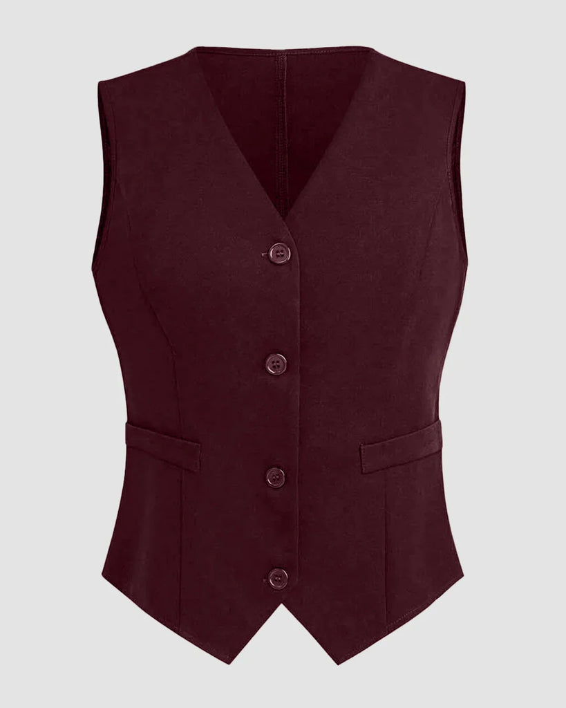 Front Button Sleeveless Faux Pocket Simple Casual Vest in Dark Maroon