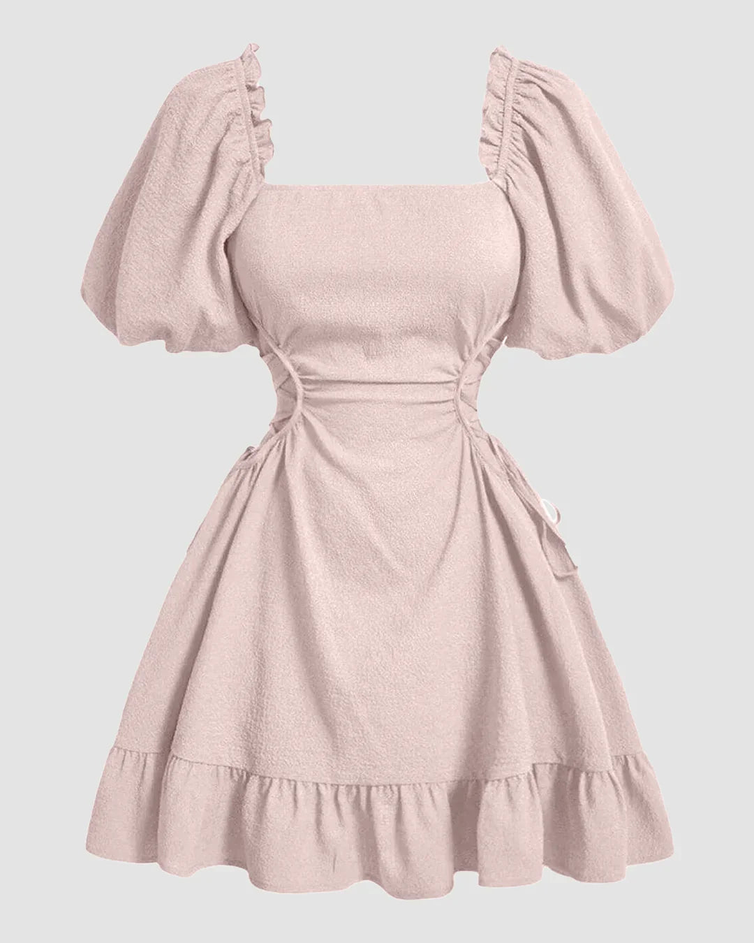 The Solid Lace Up Side Ruffle Dress in Powder Pink is the perfect mix of sweet and chic. Designed with puff sleeves, a flattering square neckline, and side lace-up details, this powder pink dress gives you a feminine silhouette with playful ruffle trims. Lightweight and stylish, it’s the kind of outfit that takes you from brunch dates to party nights with ease.