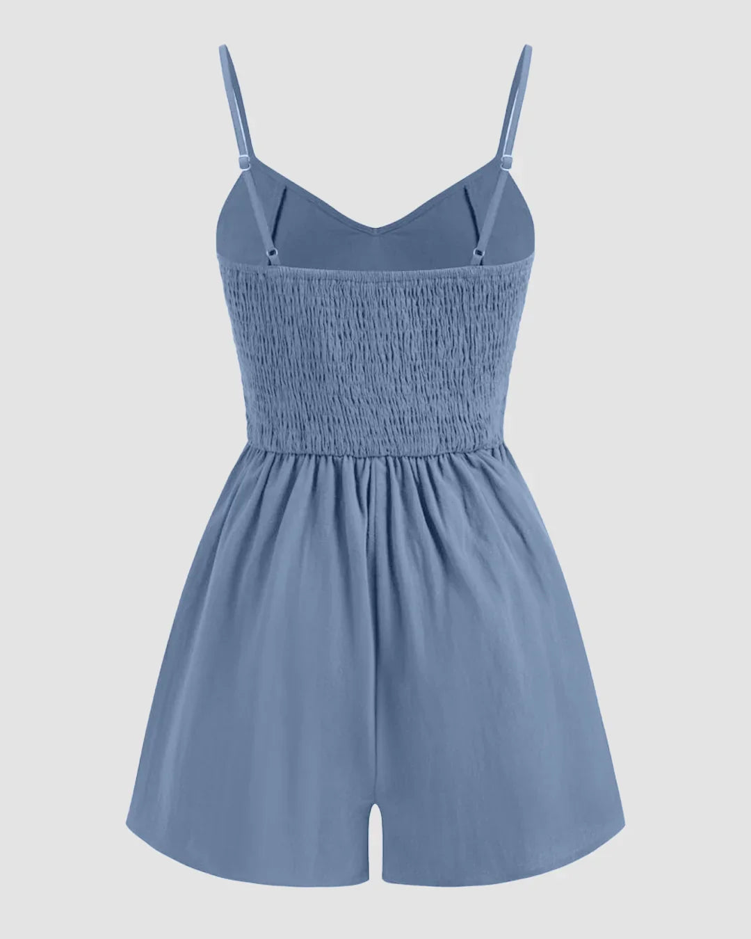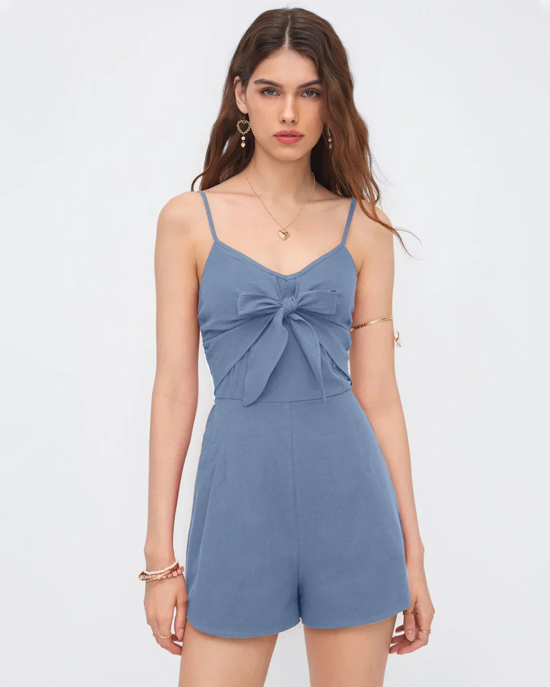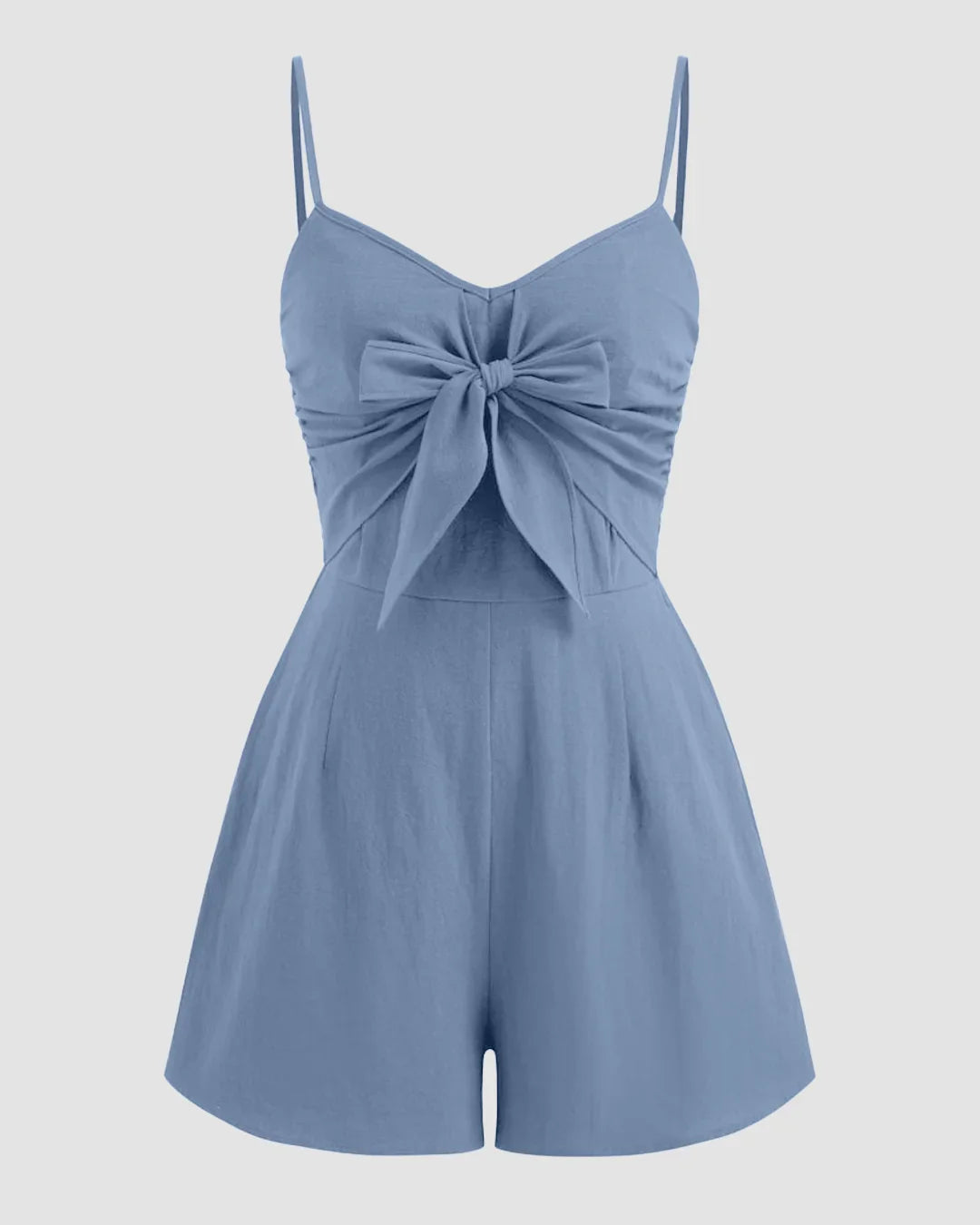 This bowknot jumpsuit is all about cute details and an easy, flattering fit. Designed with a soft V-neckline and slim spaghetti straps, it features a statement bowknot at the front that instantly elevates the look. The shirred waist defines your shape without feeling tight, while the relaxed shorts keep things breezy and comfortable. Made in a lightweight fabric, this bowknot jumpsuit feels effortless, playful, and perfect for warm-weather days when you want to look put together with minimal effort.