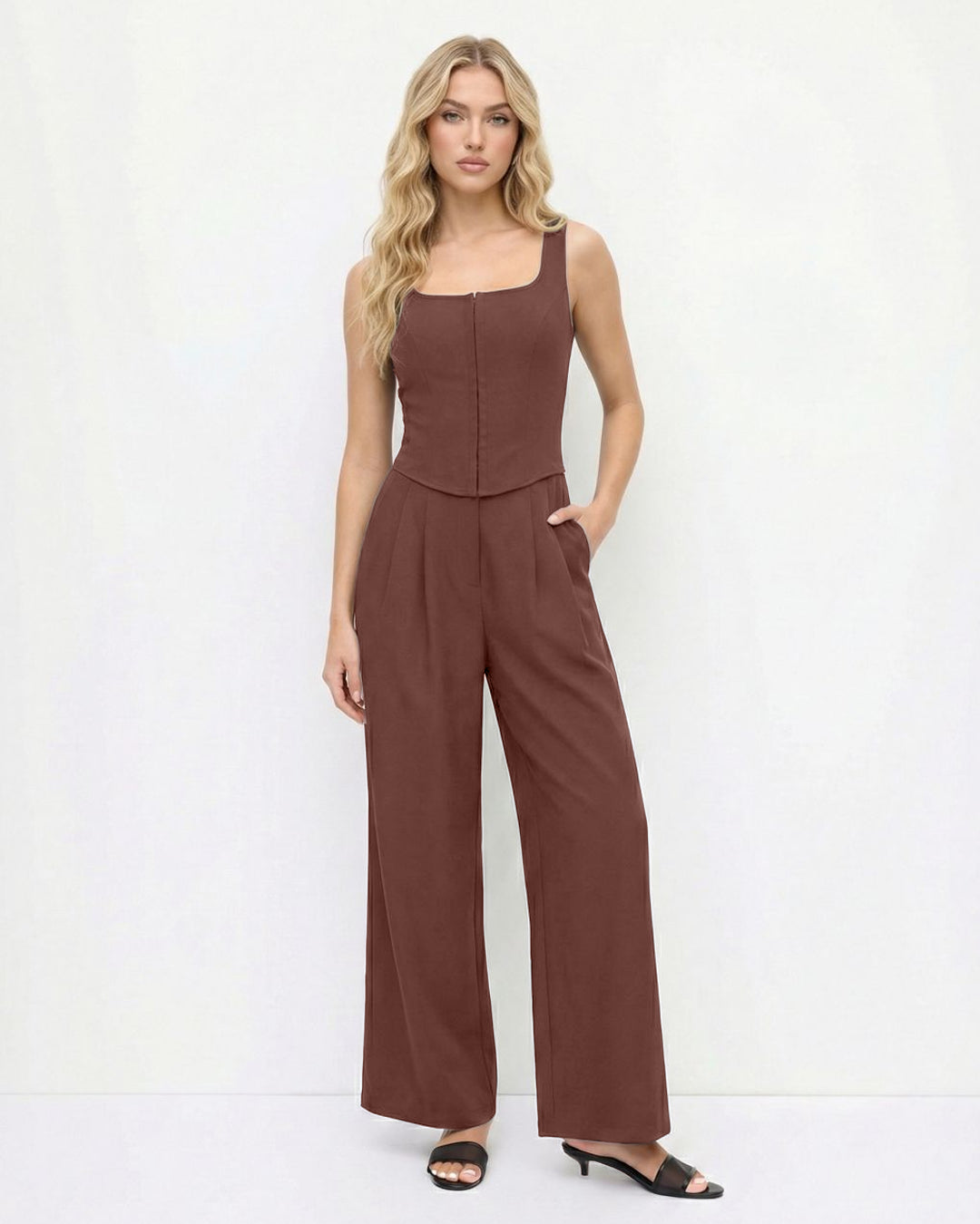 Square Neck Wide Leg Jumpsuit in Brown is sleek, effortless, and made for modern minimal styling. This wide leg jumpsuit features a clean square neckline that frames your collarbones beautifully. The fitted bodice enhances your shape, while the flowy wide leg silhouette adds graceful movement with every step. Crafted in a polyester and spandex blend, this wide leg jumpsuit feels smooth with a slight stretch for comfortable wear. The rich brown shade keeps it warm, classy, and easy to dress up or down.