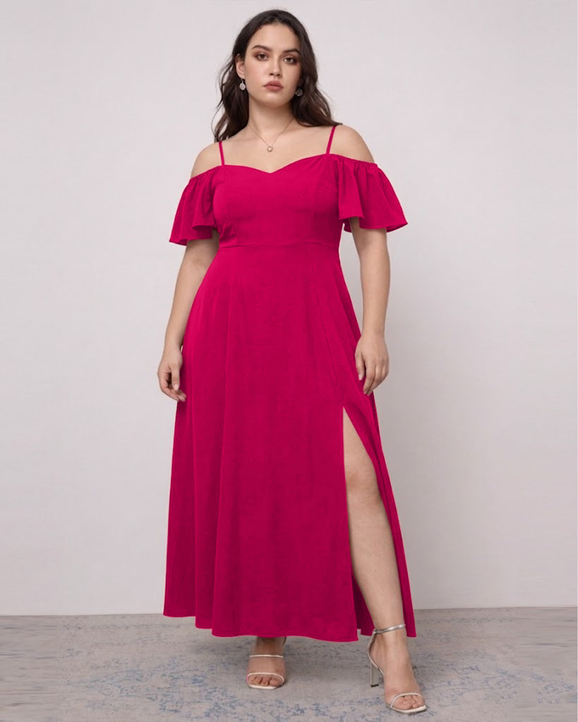 Strapless Maxi Ruffle Side Slit Flowy Dress Curve & Plus in Bright Pink