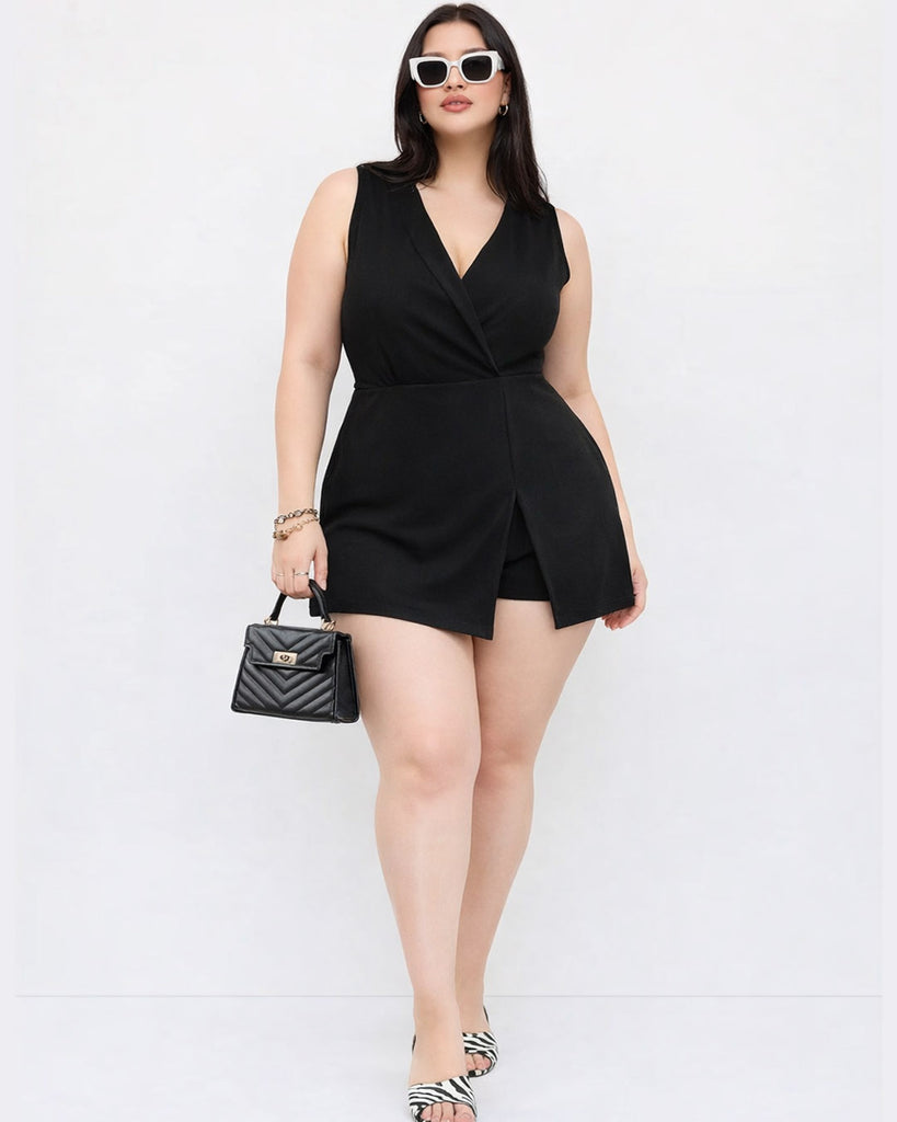 U-neckline Knotted Ruched Sleeveless Black Mini Dress Curve & Plus