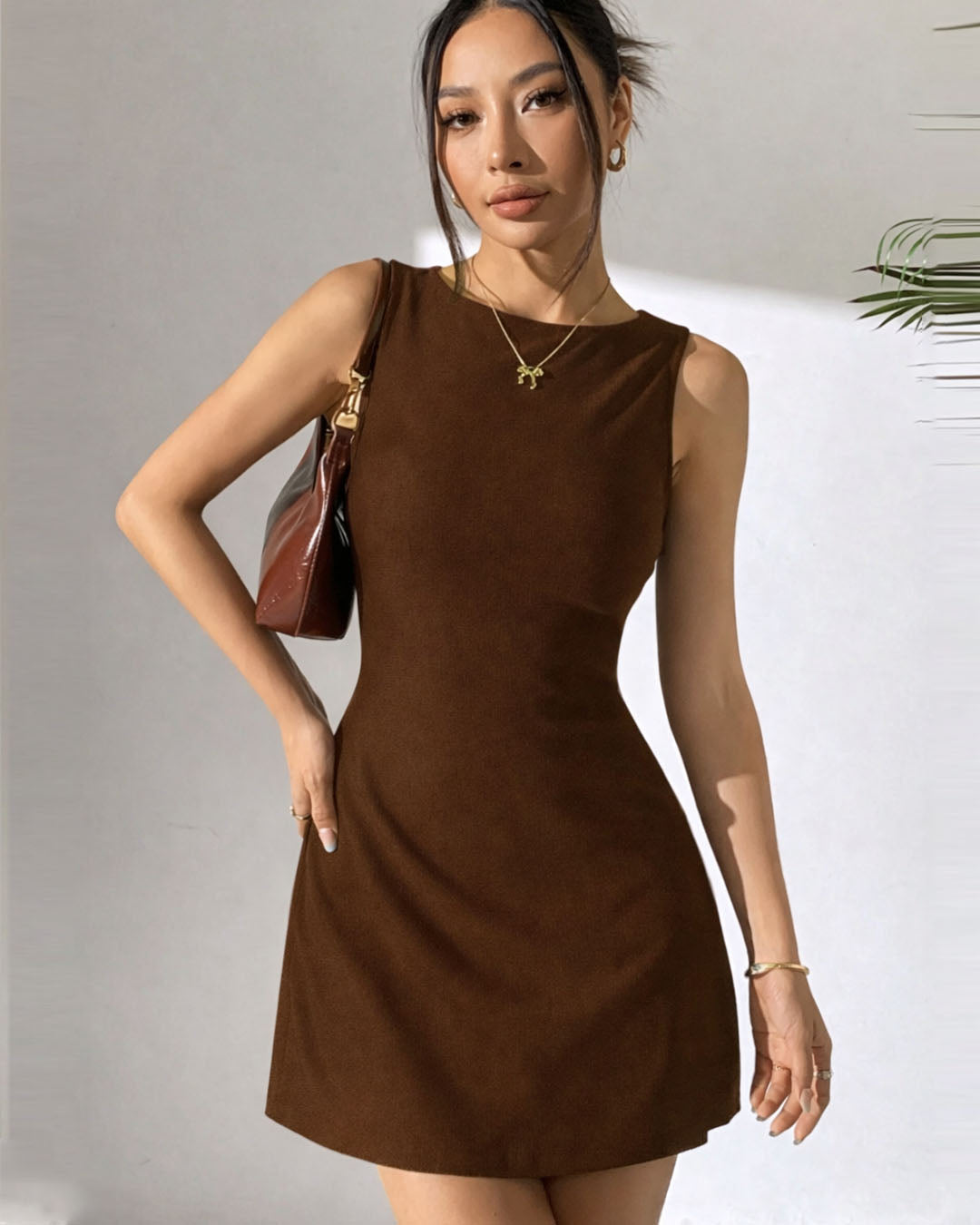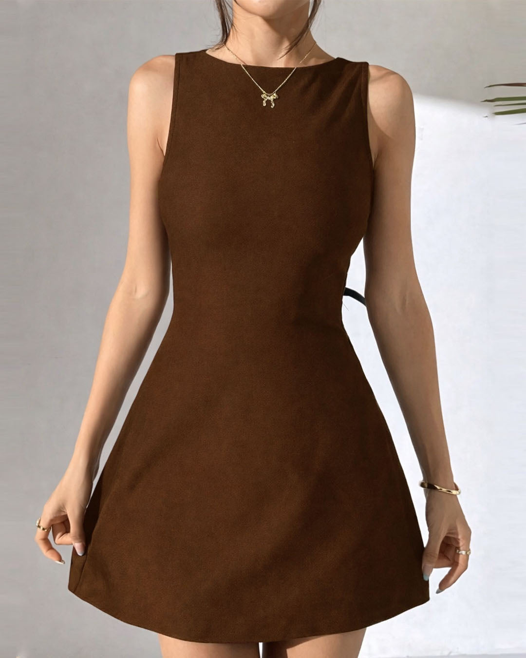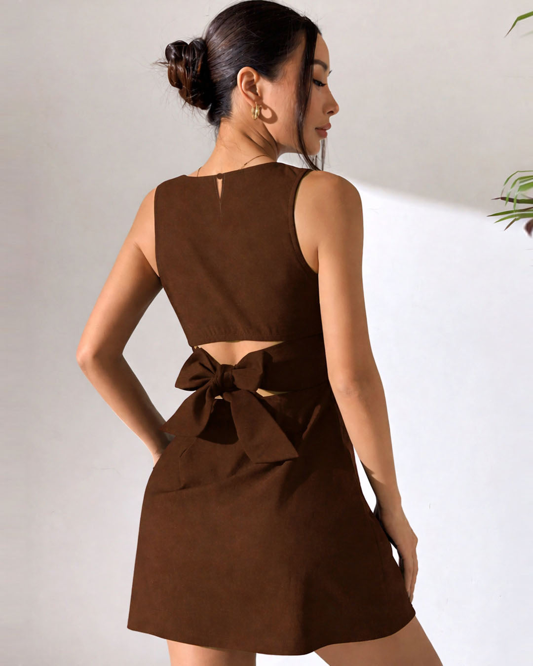 This backless mini dress is all about clean lines with a bold twist. The sleeveless cut keeps it sleek, while the smooth woven fabric gives it a structured yet flattering fit. The open back with a statement bow detail adds just the right amount of drama without going over the top. Finished in a rich dark brown shade, this backless mini dress feels elevated, modern, and perfect for days when you want to keep things minimal but striking. The soft inner lining makes it comfortable while still holding its shape beautifully.