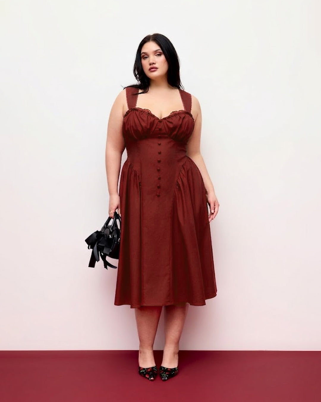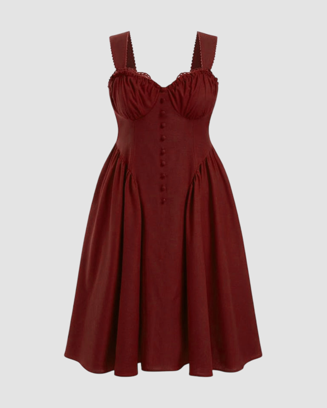 Sweetheart Neck Ruffled Lace Up Flared Maxi Dress Curve & Plus in Merlot Red is a romantic and flattering piece designed to celebrate curves with elegance and comfort. This sweetheart neck ruffled lace up dress features a softly gathered neckline with delicate ruffle detailing that enhances the feminine appeal. The fitted bodice is complemented by a button-front design and subtle lace-up accent, creating a beautifully structured yet comfortable fit. Flowing into a flared skirt, this sweetheart neck ruffled lace up dress offers graceful movement and a flattering silhouette.