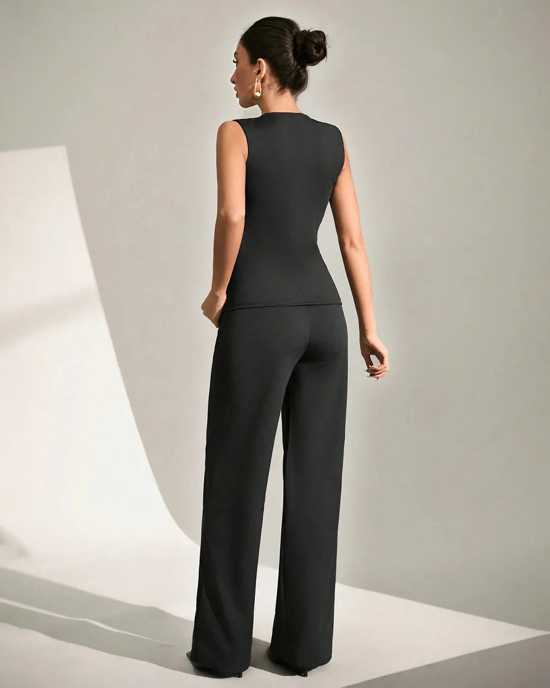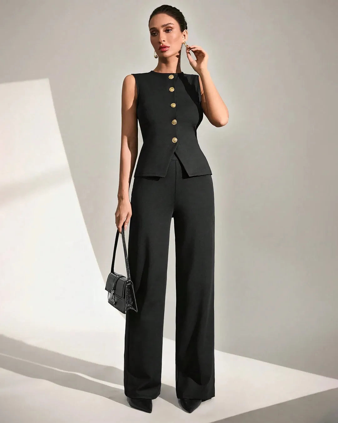 This pant top set is a sleek, power-dressing essential. The sleeveless peplum top with gold button accents sculpts the waist, while the wide-leg pants create a graceful, elongated silhouette. Designed to move seamlessly between professional and evening settings.