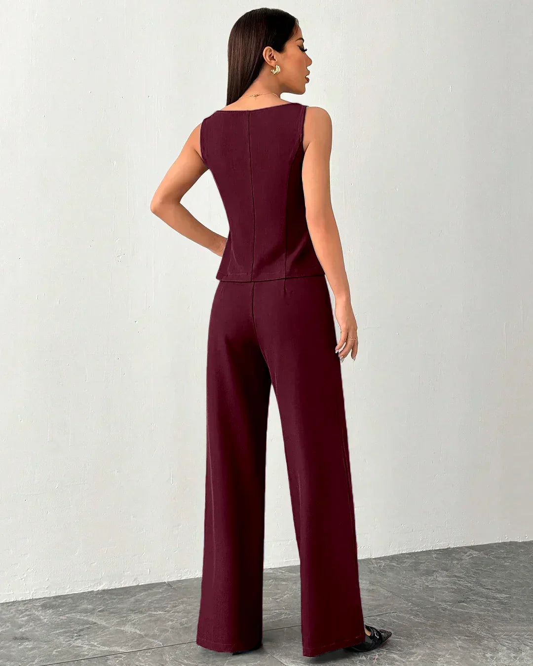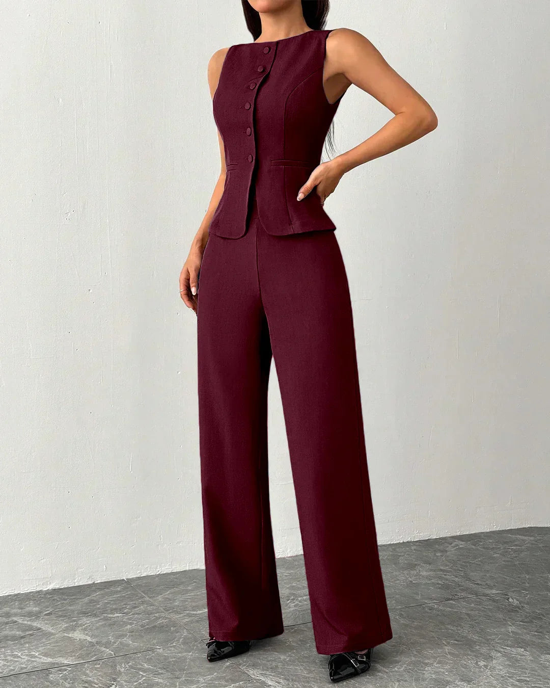 Sleeveless Buttoned Vest & Wide-Leg Trouser Co-Ord in Burgundy