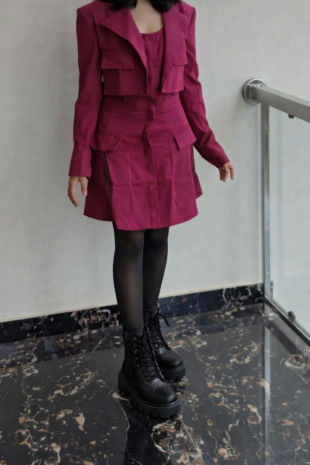 Introducing our Turndown Collar Blazer & Bustier Two Piece Dress In Burgundy.