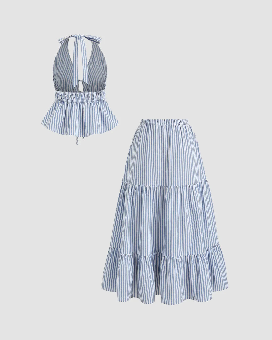 The Two-Piece Halter Neck Top and Maxi Skirt Set is your new go-to for sunny days and easy-breezy style. Designed with a tie-up halter neckline and a flattering smocked waist, the top pairs effortlessly with the flowy tiered maxi skirt. This maxi skirt and top set blends casual charm with a hint of playful elegance, making it perfect for beach days, picnics, or a casual brunch with friends.