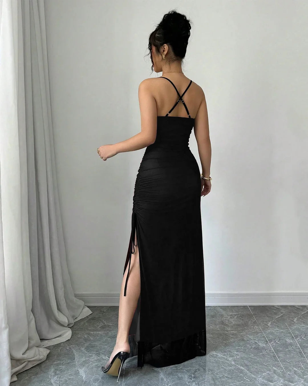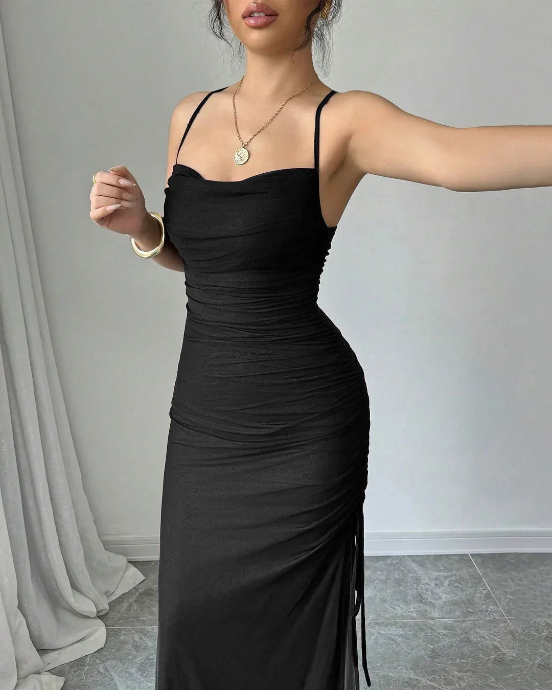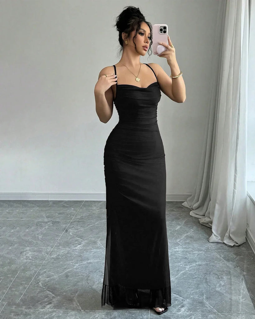 Black Sweetheart Neck Spaghetti Strap Ruched Bodycon Maxi Dress