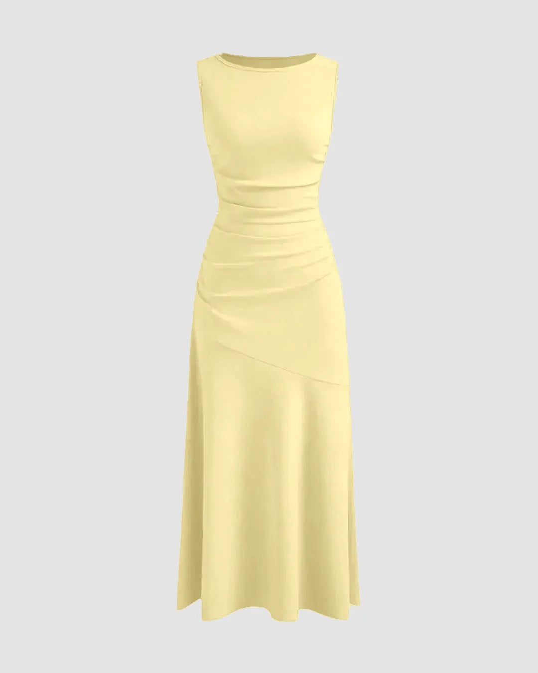 The Boat Neck Solid Ruffle Ruched Vanilla Maxi Dress serves elegance with ease. This boat neck dress features side ruching and a sculpted waist for a flattering fit that flows into a soft, asymmetrical hem. The vanilla tone adds a gentle charm that transitions seamlessly from daylight to evening sparkle.