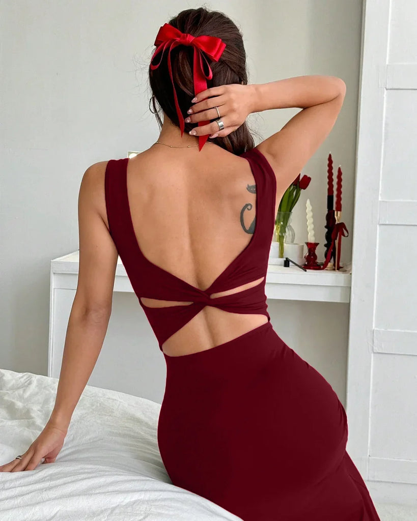 Burgundy Sleeveless Bodycon Maxi Dress with Side Slit and Cutout Back Detail