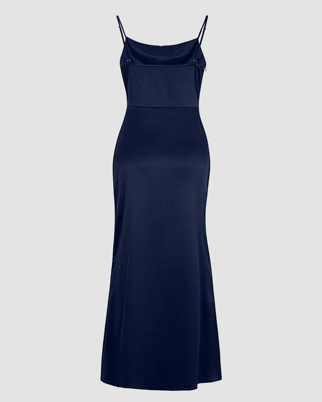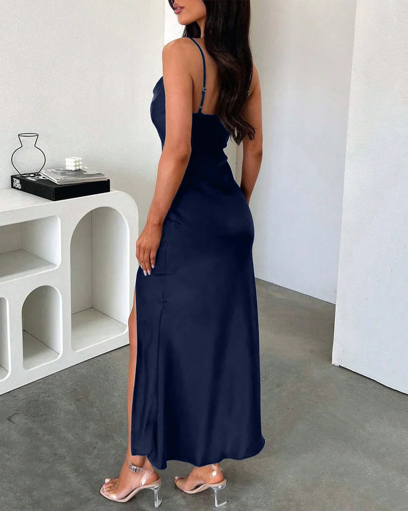 The Cowl Neck Ruched Slit Sleeveless Satin Maxi Dress in Navy Blue is designed to turn heads with its sleek silhouette and elegant shine. The cowl neckline drapes softly for a delicate touch, while the ruched detailing along the waist enhances your natural shape. The side slit adds just the right amount of edge, keeping the look bold yet graceful. Crafted in smooth satin fabric, this satin maxi dress feels silky and lightweight on the skin, making it perfect for parties or evening occasions.