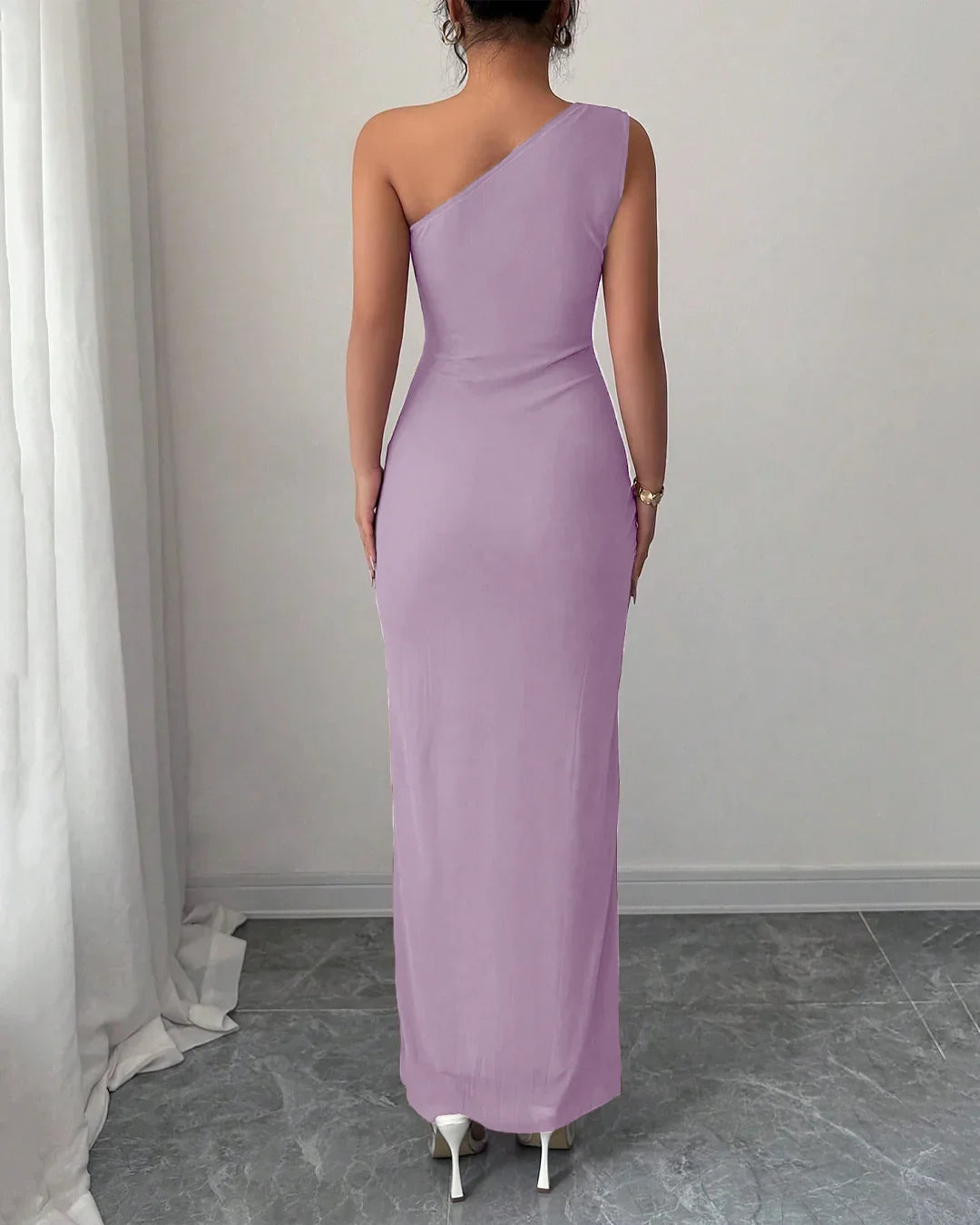 One-Shoulder Ruched Slit Maxi Dress in Lilac