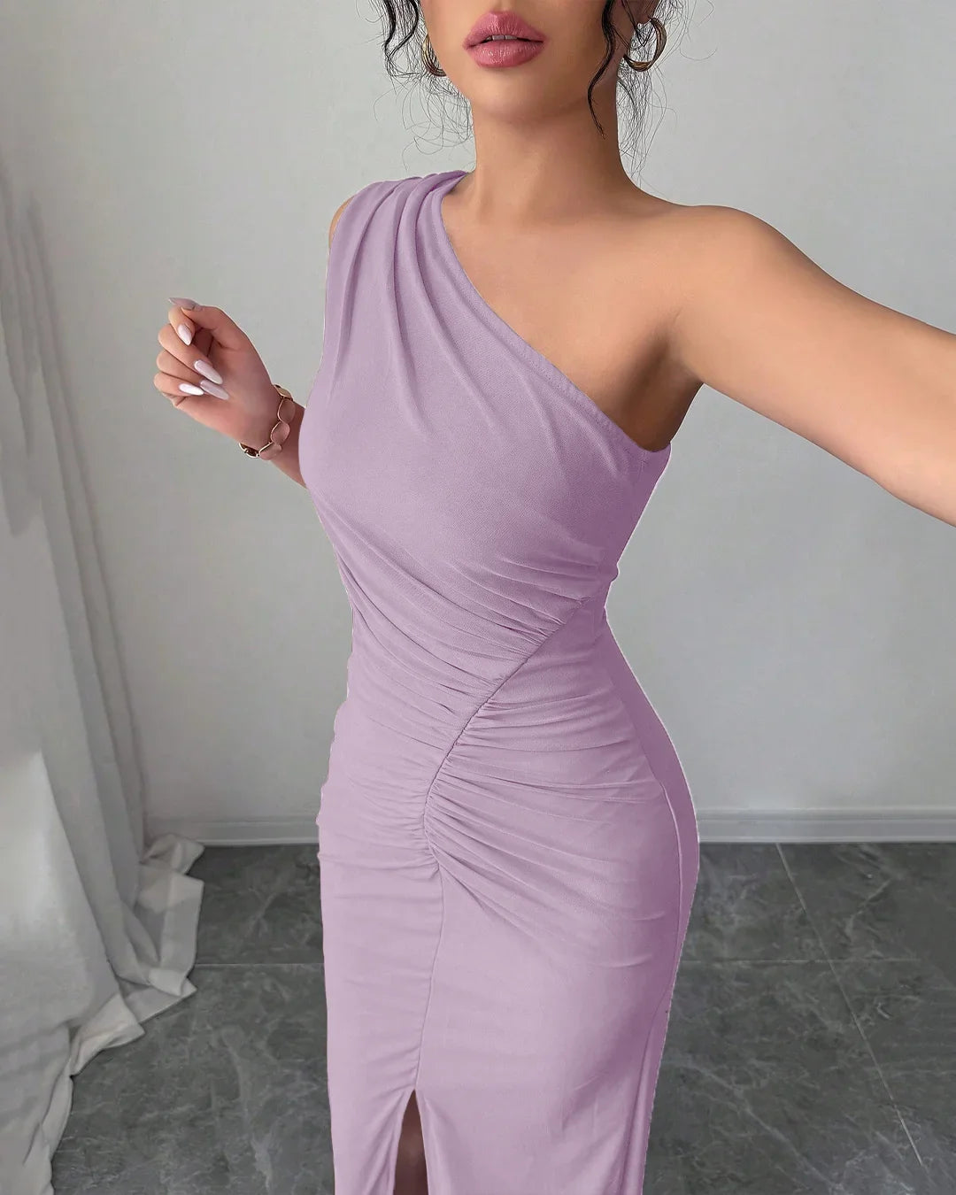 The One-Shoulder Ruched Slit Maxi Dress in Lilac is a bold yet elegant pick for evenings when you want to make an impression. With a flattering ruched bodice, sleek one-shoulder neckline, and thigh-high slit, this dress balances sophistication with a daring edge. A perfect lilac maxi dress for nights out, weddings, or special celebrations.
