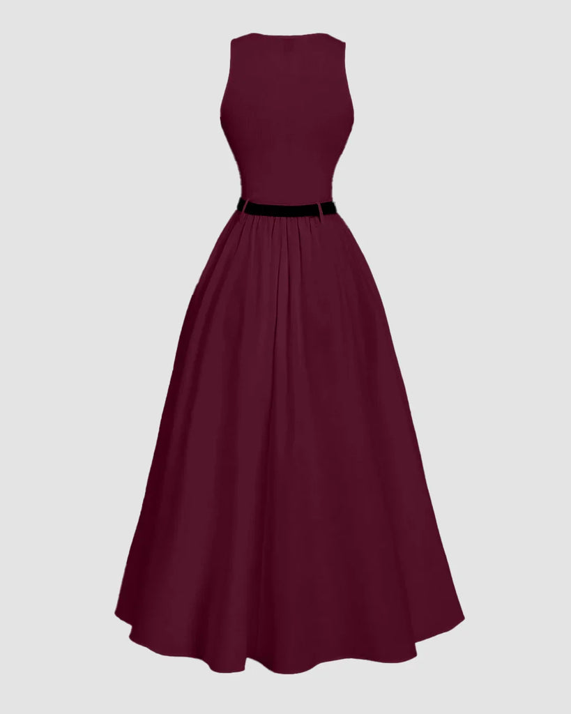 Round Neck Sleeveless A-Line Maxi Dress in Burgundy Without Belt