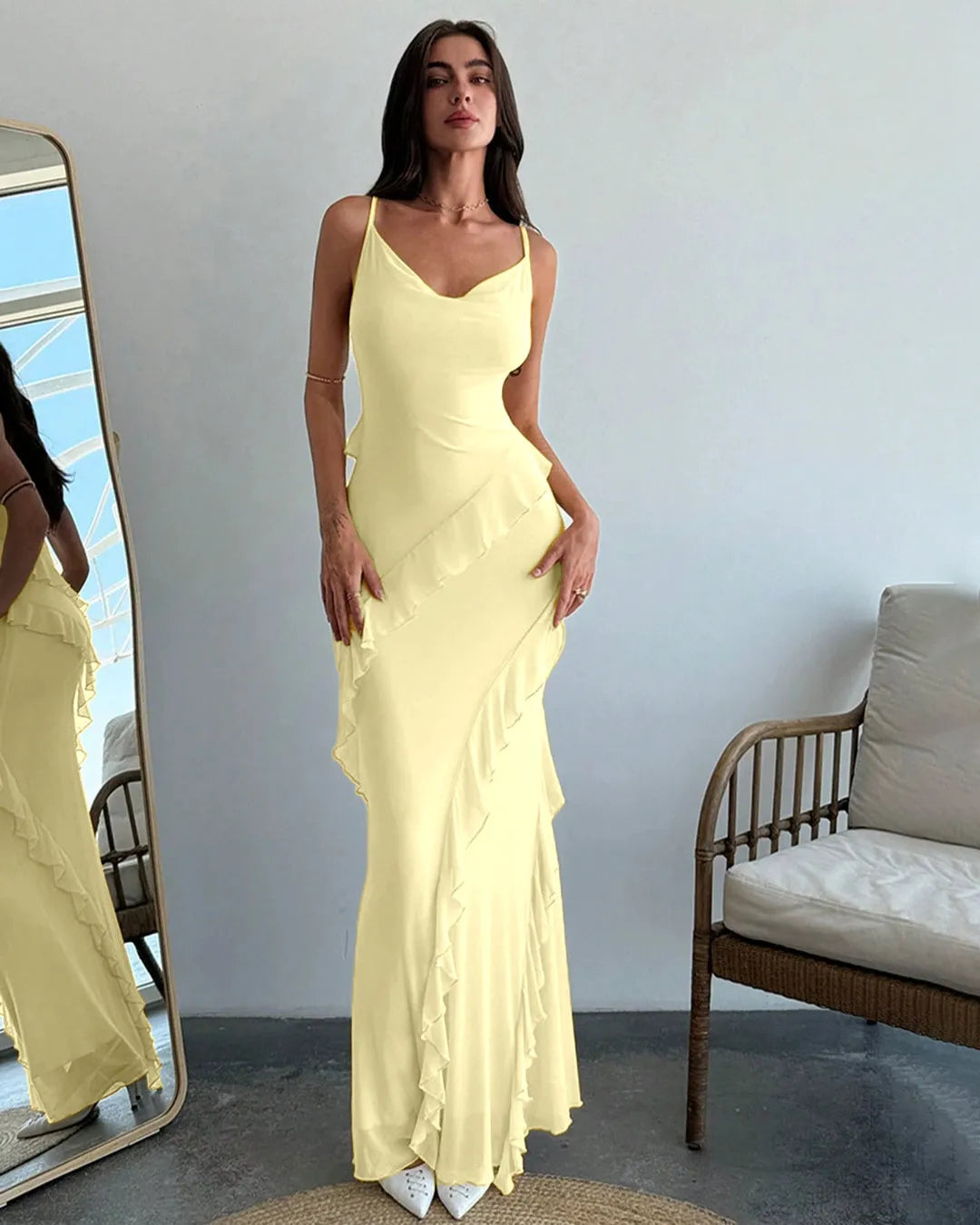 - Cowl neckline and spaghetti straps highlight your collarbones