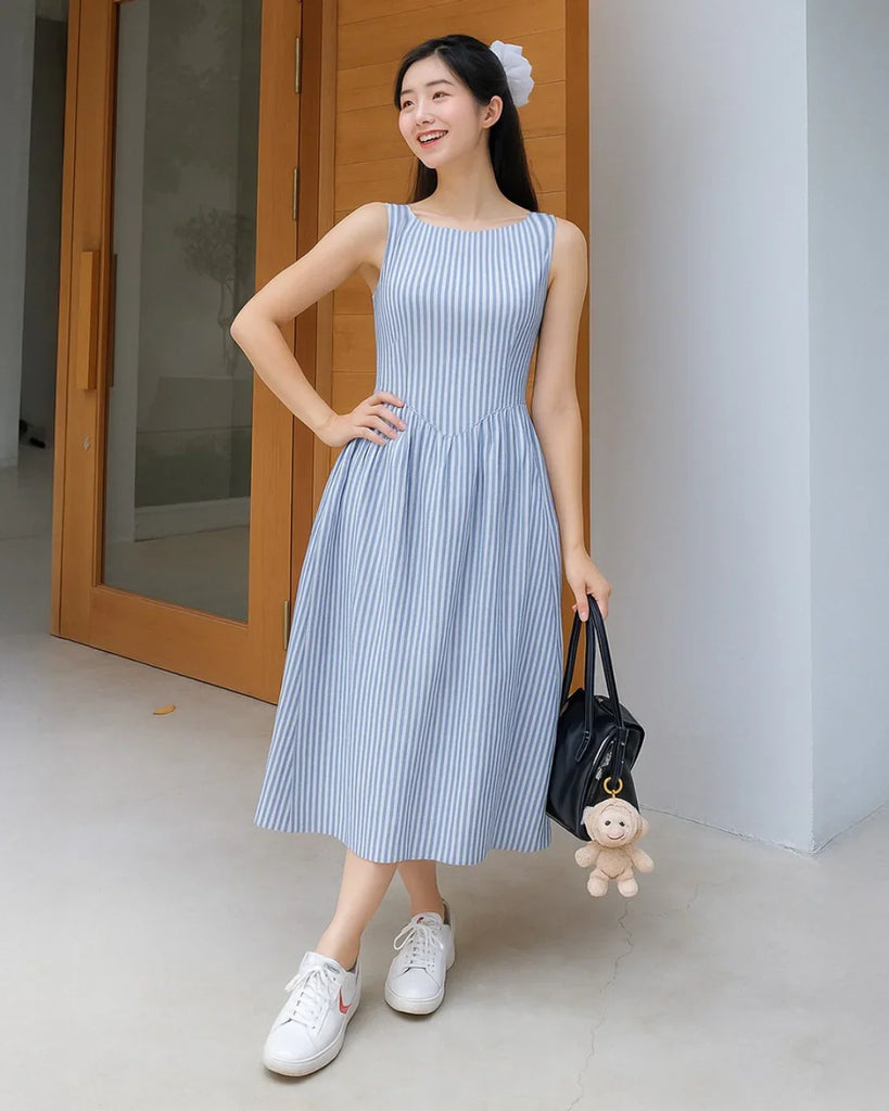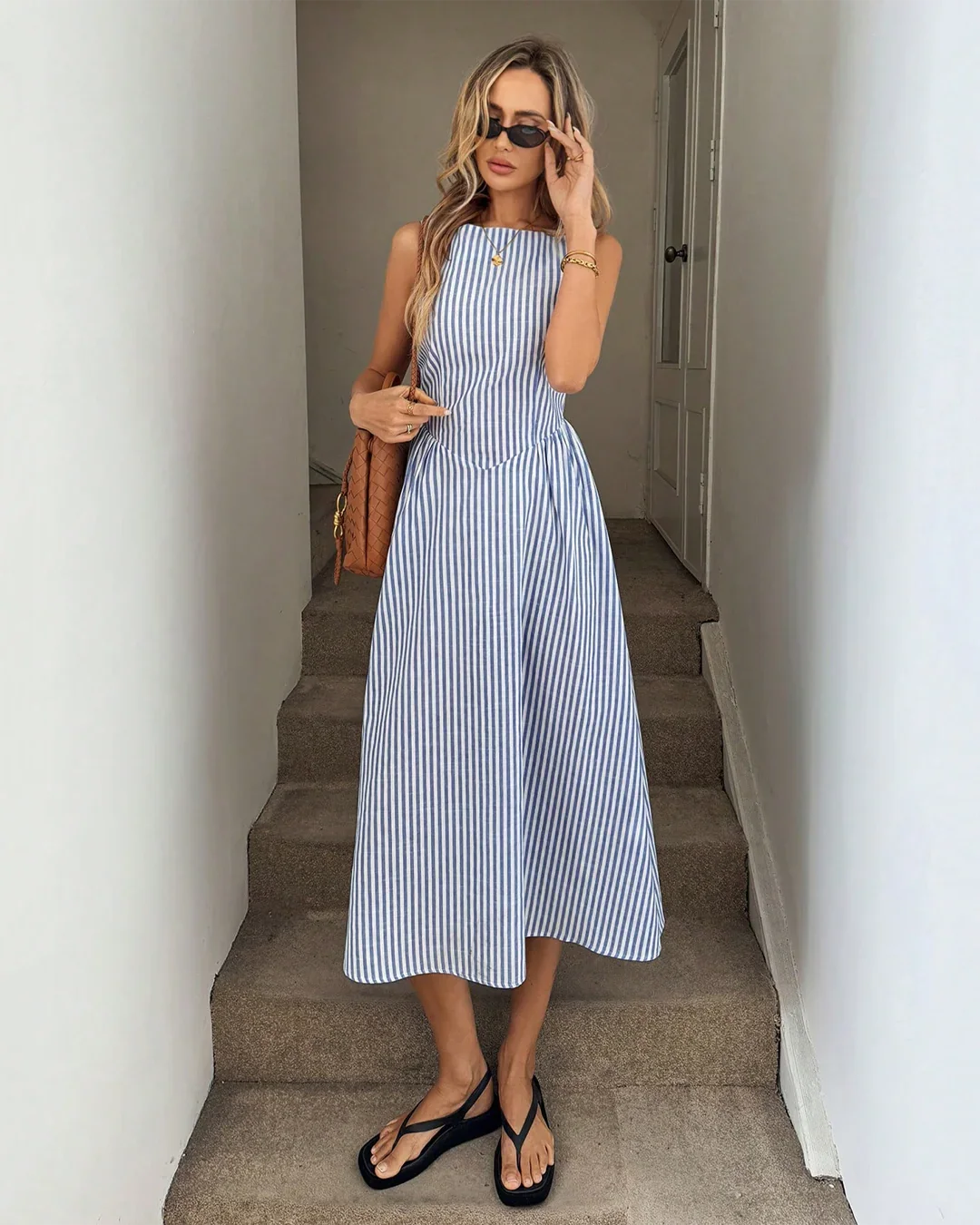 Introducing our Sleeveless Boat Neckline Striped Maxi Dress. This striped maxi dress brings timeless elegance with a fresh, easy-breezy vibe. The clean vertical lines and tailored boat neckline shape your silhouette effortlessly, while the flowy fit gives that twirl-worthy comfort.