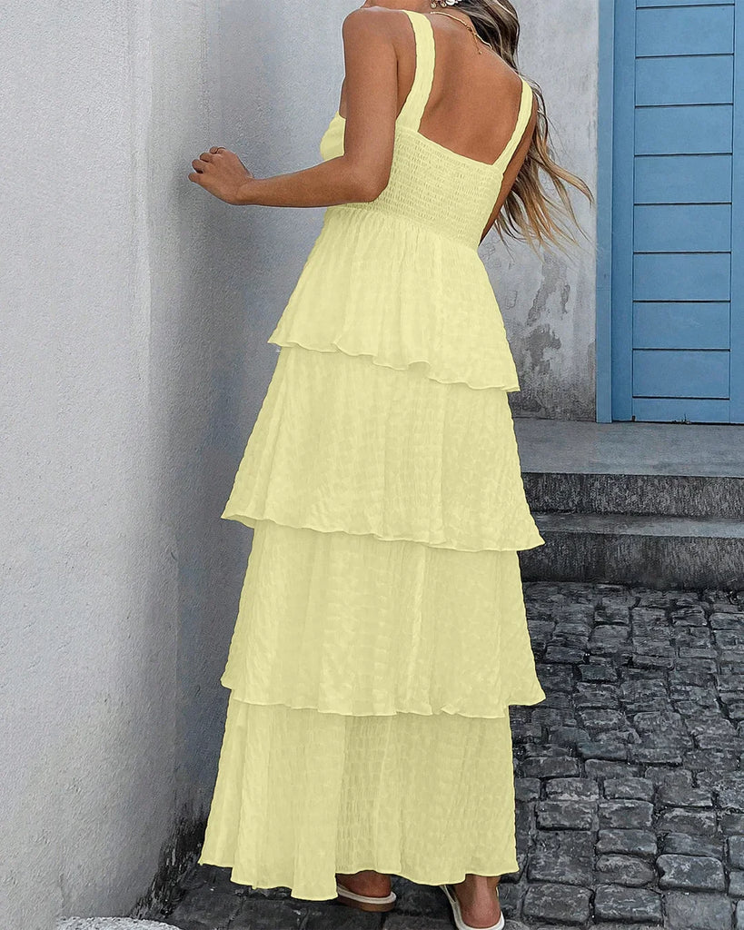 Square Neck Layered Ruffle Sleeveless Maxi Dress in French Vanilla