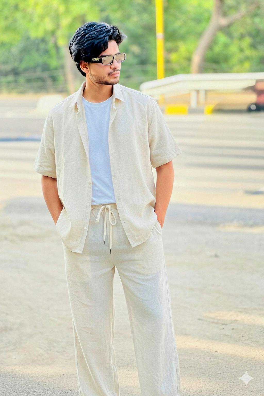 These mens two piece outfits offer a relaxed, stylish look designed for everyday comfort. Featuring a lightweight short-sleeve shirt paired with matching straight-fit pants, this set creates a clean and coordinated style. The soft white tone gives a fresh, minimal feel, making it easy to wear across seasons. These mens two piece outfits are perfect for men who prefer effortless dressing with a modern touch.
