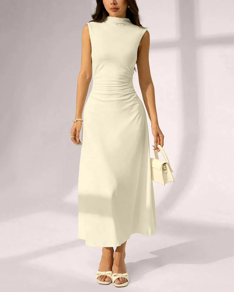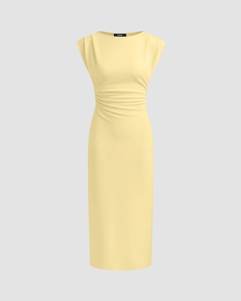 Vanilla sleeveless midi dress featuring side ruched detail, elegantly designed for a stylish look.