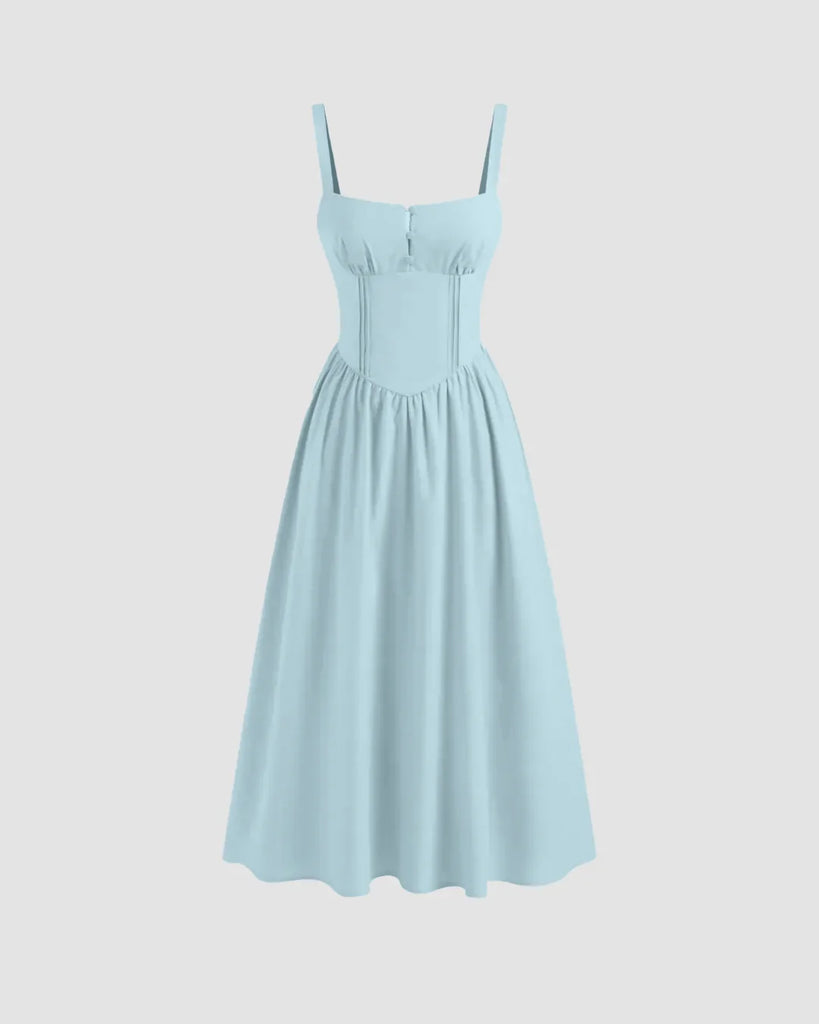 Light blue midi dress with ruffled straps, scoop neckline, and a fishtail hem for elegant movement and playful charm