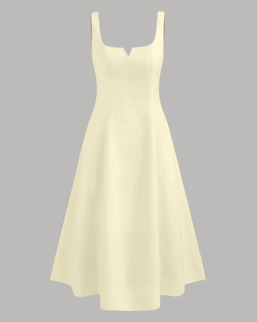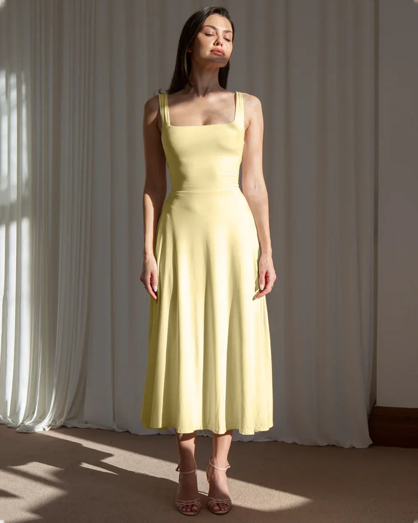 A vanilla bodycon midi dress with a square neckline, featuring a sleek, figure-hugging silhouette from top to hem.
