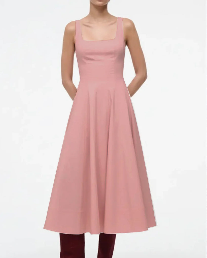 A rose pink sleeveless midi dress featuring a square neckline and an accentuated waist for a structured, elegant silhouette.