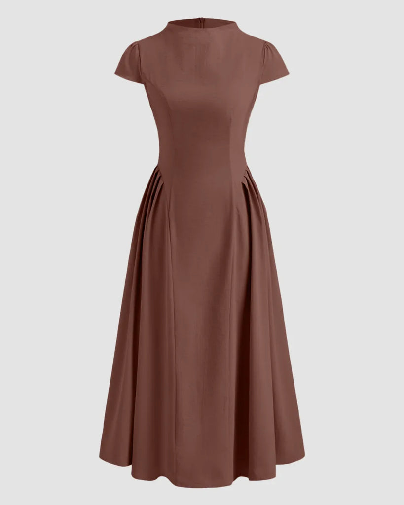 A woman poses in a maroon cap sleeve fit and flare midi dress, showcasing its elegant silhouette against a neutral background.