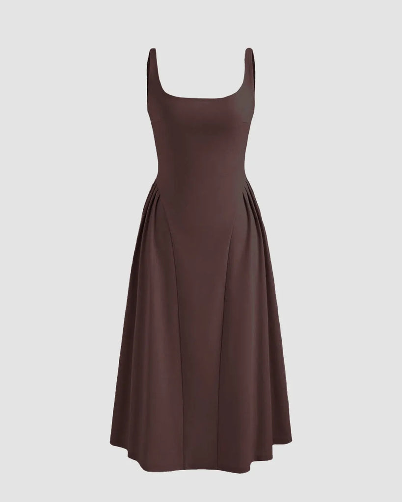 Brown scoop neck retro style midi dress with a square neckline, featuring a rich chocolate color