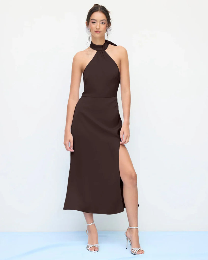 Maroon halter-neck midi dress with a back tie and gathered detailing for a rich, elegant drape.
