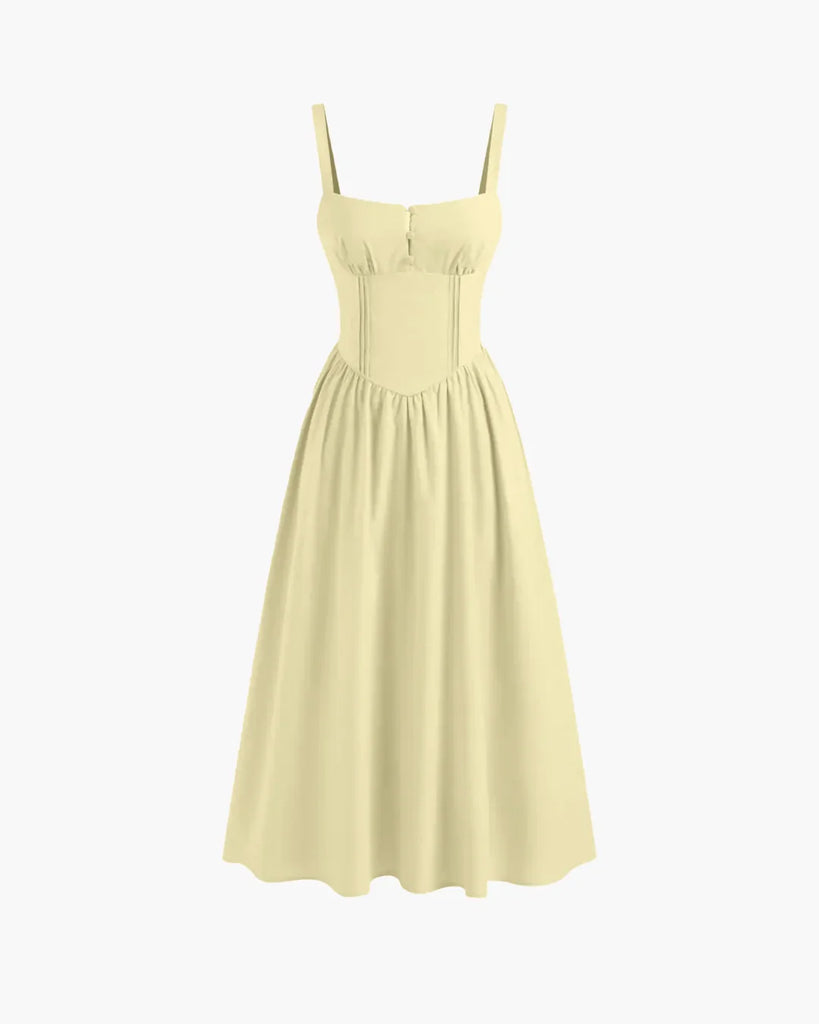 A vanilla-toned bodycon midi dress featuring a square neckline and cap sleeves for a structured yet elegant look.
