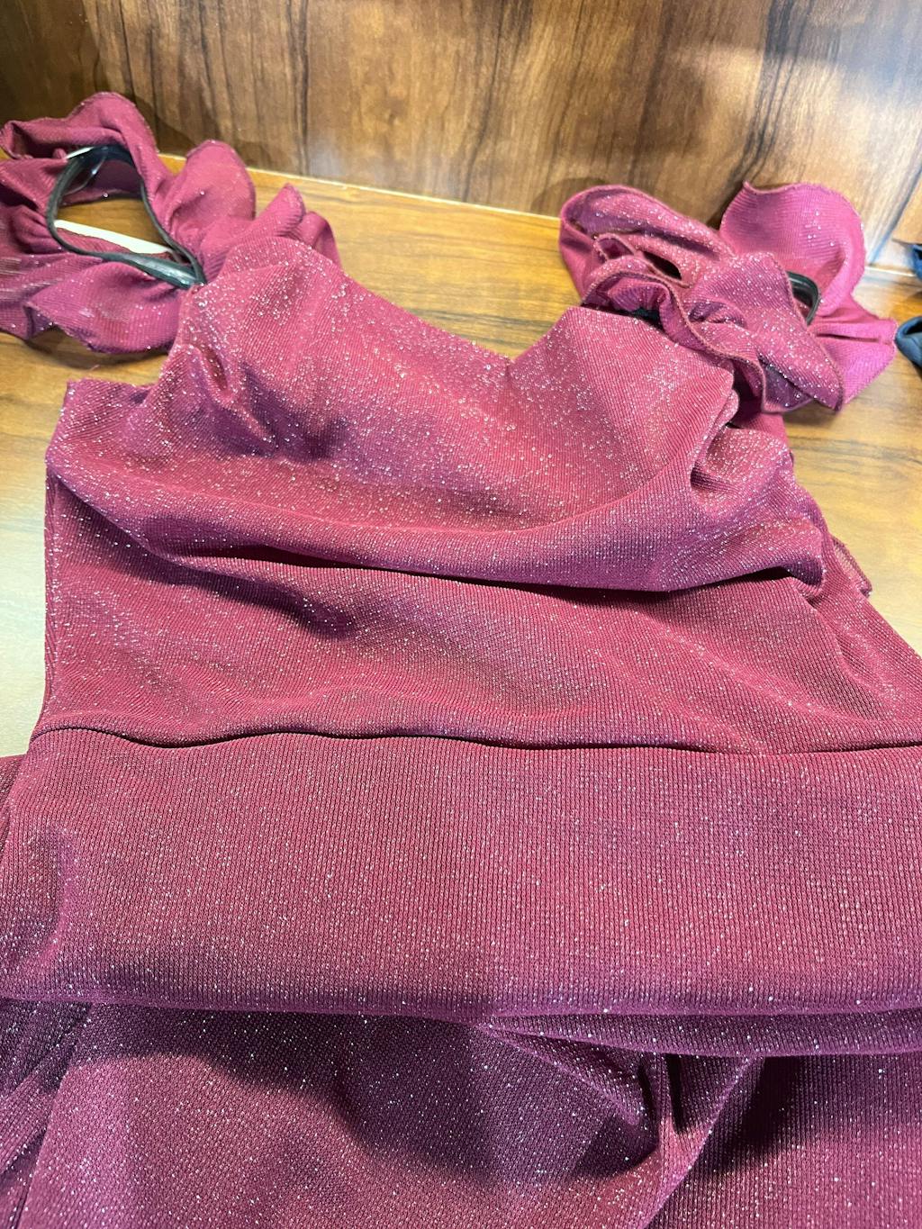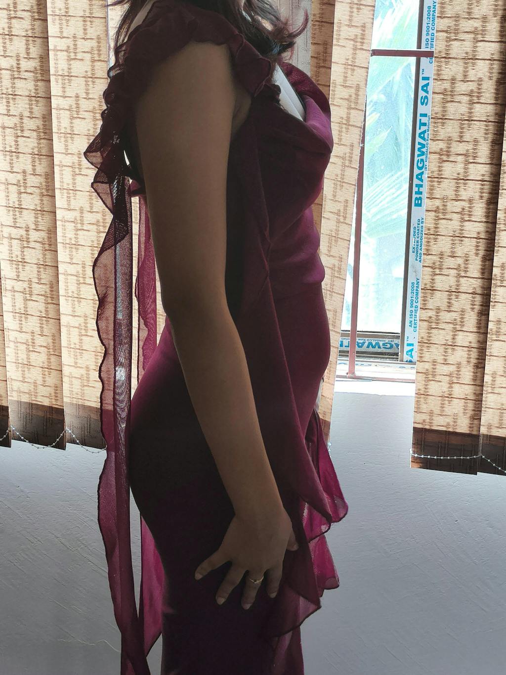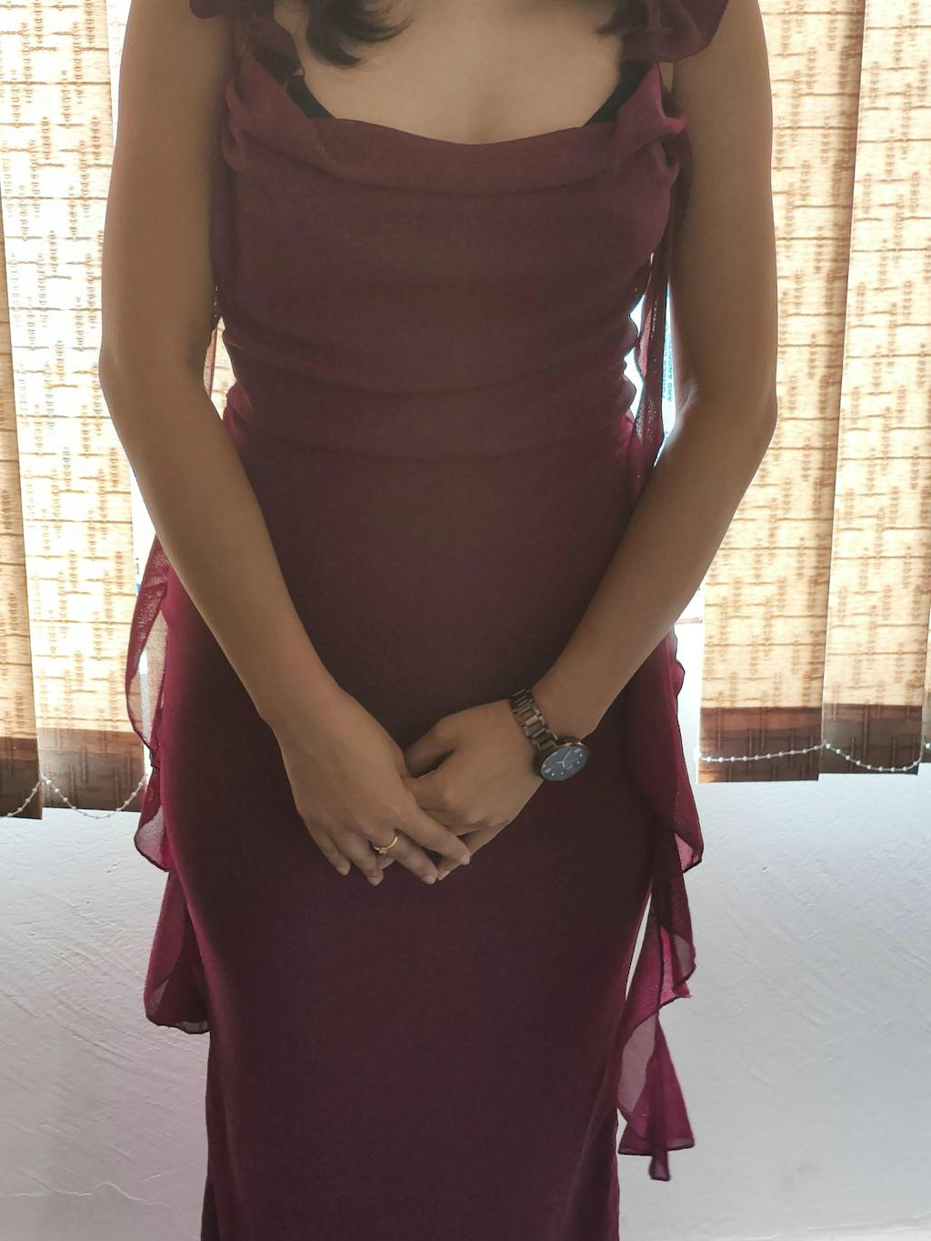 This black midi dress brings effortless elegance with its ruched fit and cascading mesh ruffles. The curve-hugging silhouette creates a sleek, flattering shape, while the shimmer detail adds just enough glam for a standout look. Lightweight and sleeveless, it feels soft against the skin and moves easily, making it your go-to pick for nights that call for something bold yet comfortable.