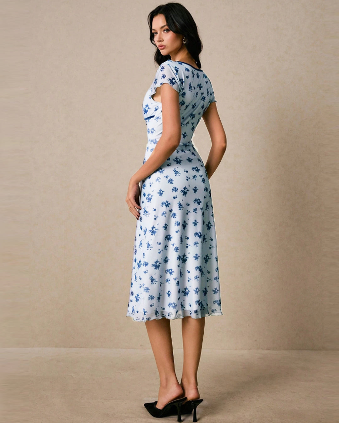 Blue Floral Print V-Neck Lettuce Trim Midi Dress