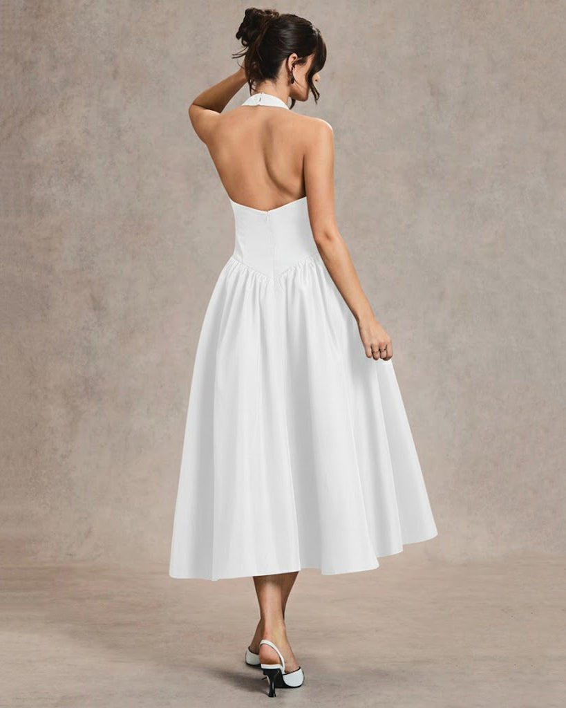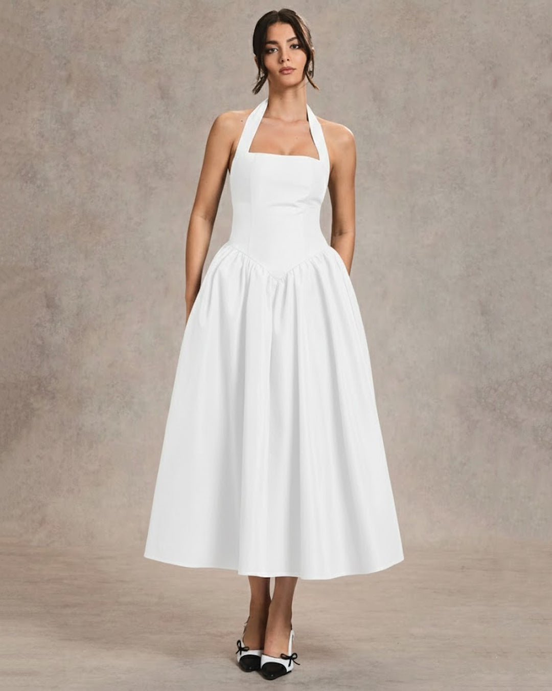 This White Halter Neck A-Line Midi Dress is made to give a classic, elegant look with a soft, structured shape. The fitted bodice highlights the waist, and the wide, flowy dress adds a graceful touch that moves easily. The halter neckline adds a clean and timeless style, making this A-Line Midi Dress perfect for women who love simple yet standout outfits.