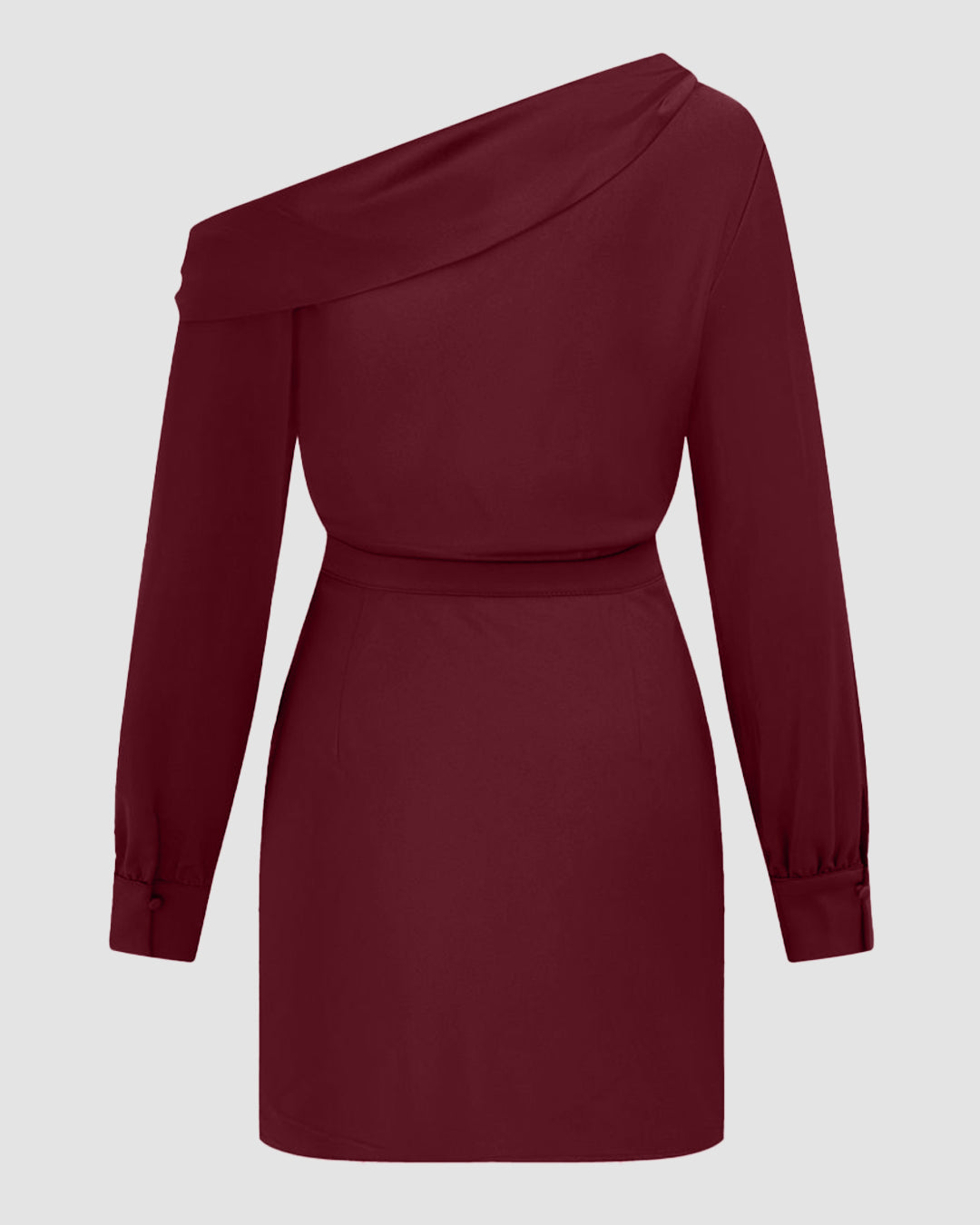 Asymmetrical Neck Pleated Wrap Mini Dress in Red